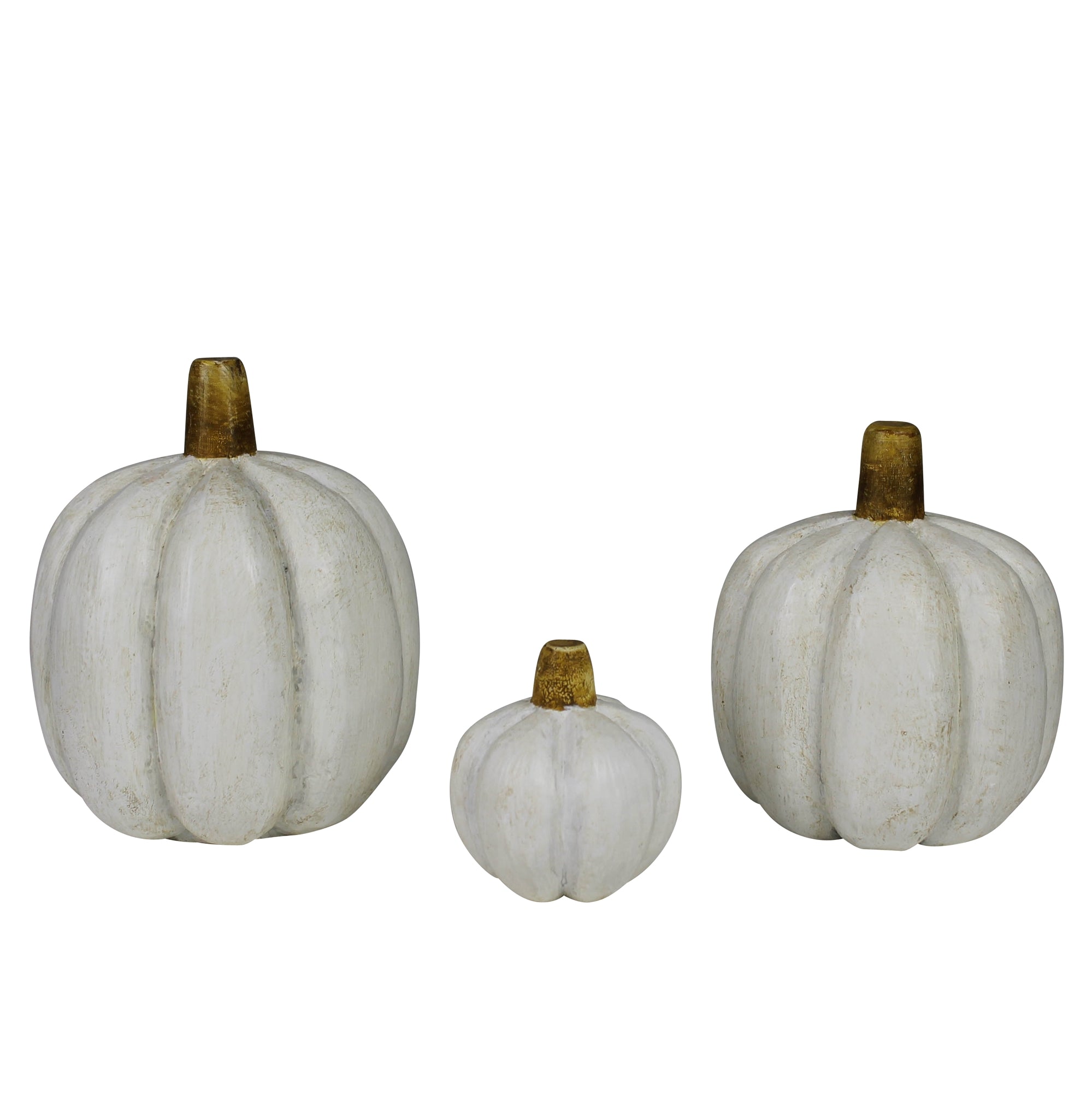 Carved of wood with a soft white finish and gold stem, this set of 3 pumpkins adds subtle charm to autumn décor. Set of 3: $6, $9, $9, Sm: 2x2x2.5, Med: 3.5x3.5x4.25, Lrg: 4x4x5