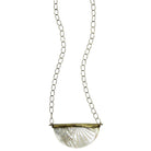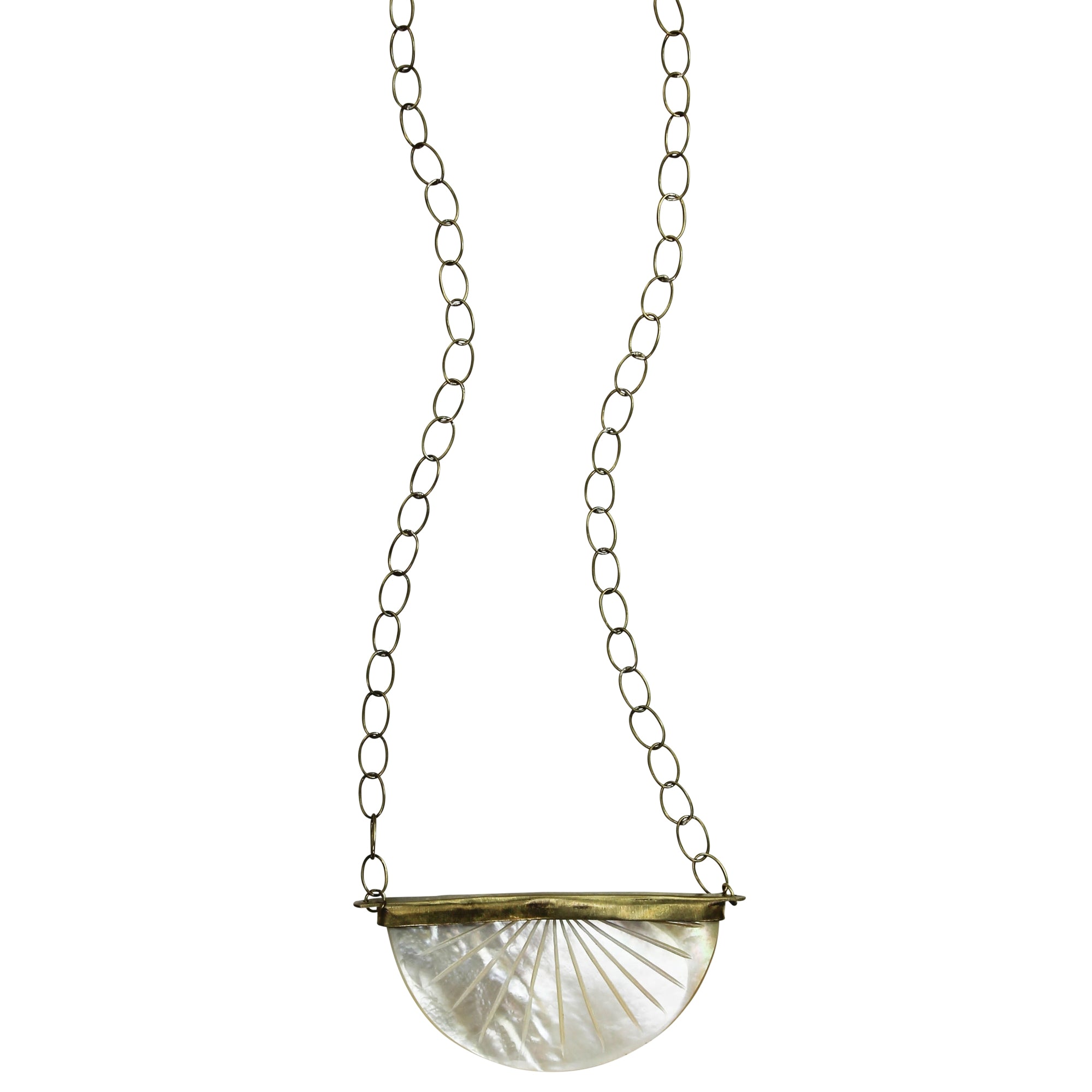 The luster in Mother of Pearl is further enhanced with an etched pattern, catching the light, and creating a dazzling necklace that goes from casual to dressy. The pendant hangs on 18” of adjustable brass chain. pendant on 18” of adjustable brass chain