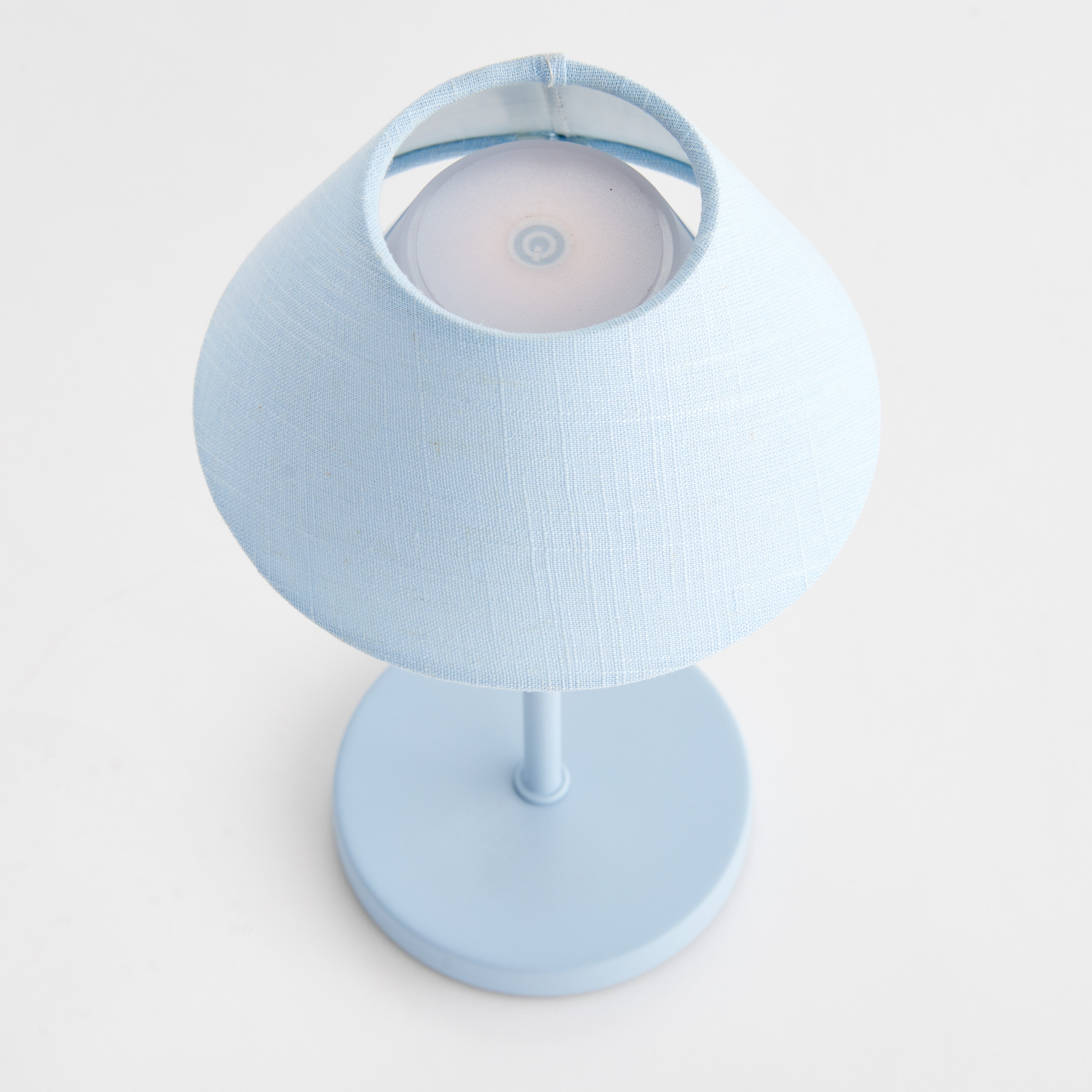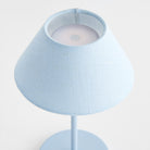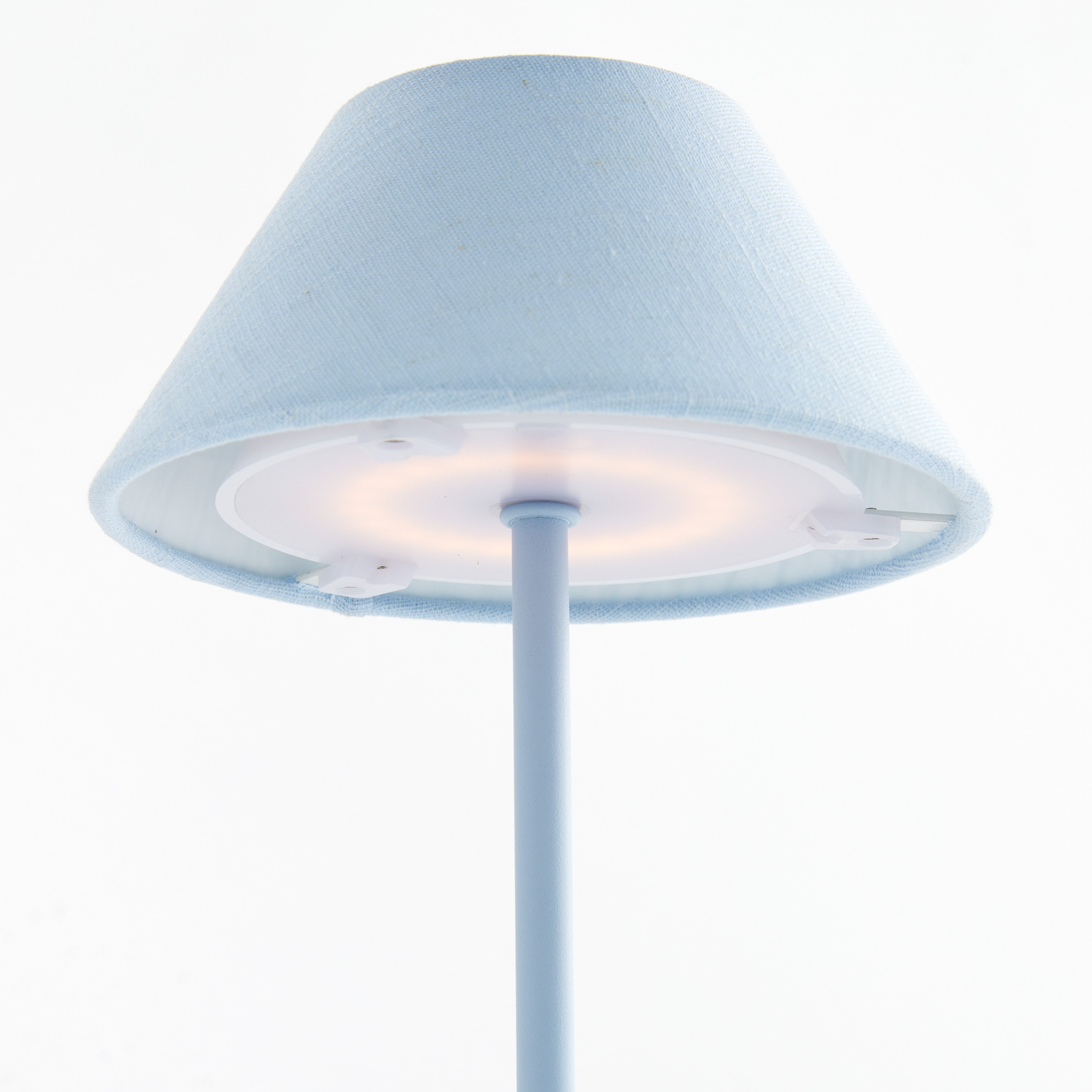 -Light Blue;-Easy touch On/Off and brightness settings: Candlelight (2200k), Warm White (2600k), Cool White (3000k);-Light longevity at full charge: 10 hours at full light intensity;-Total lumens: 200;-Charge time: 6 hours;-Charging station with USB- A cord included;-Shade material: linen;-IP44 rated for damp conditions
