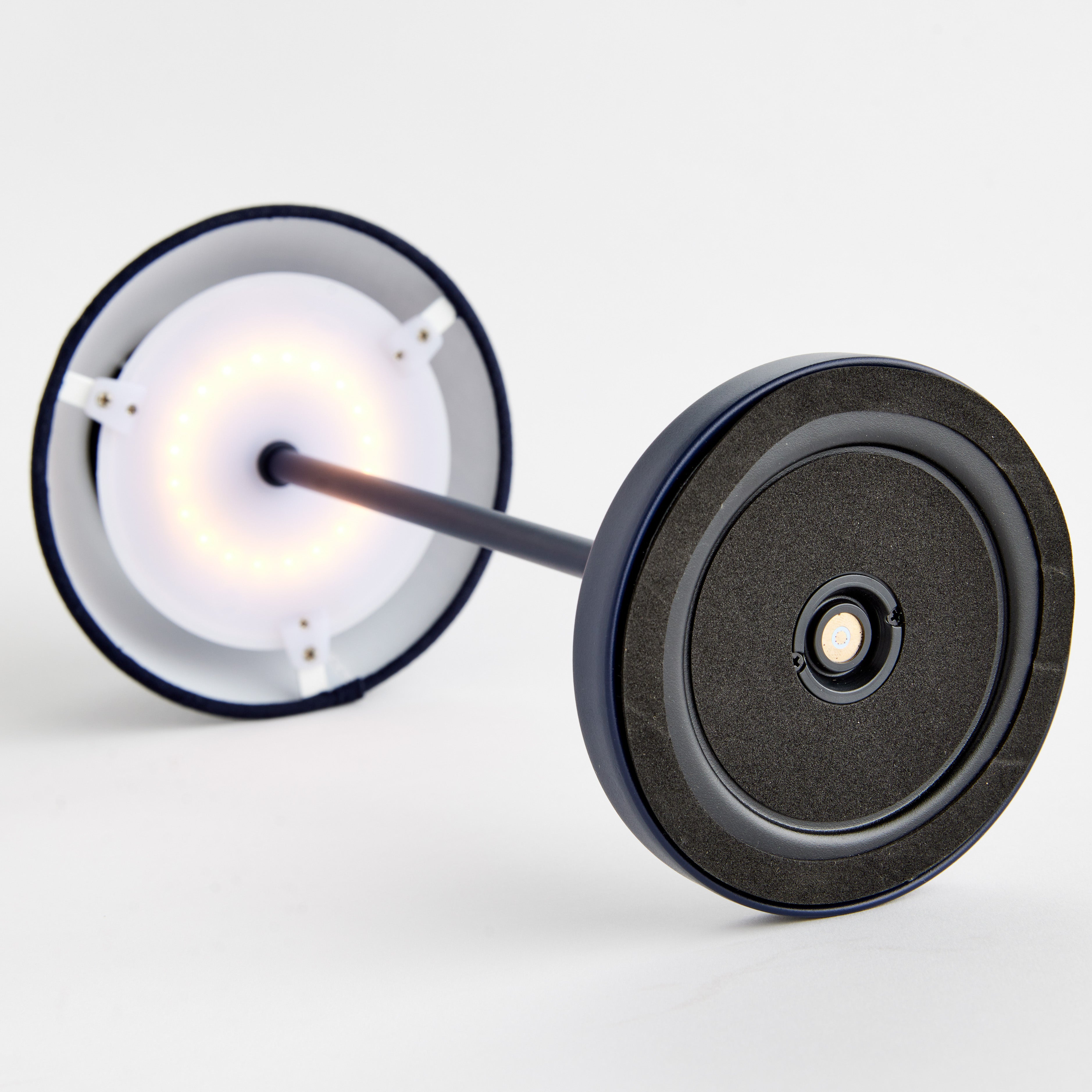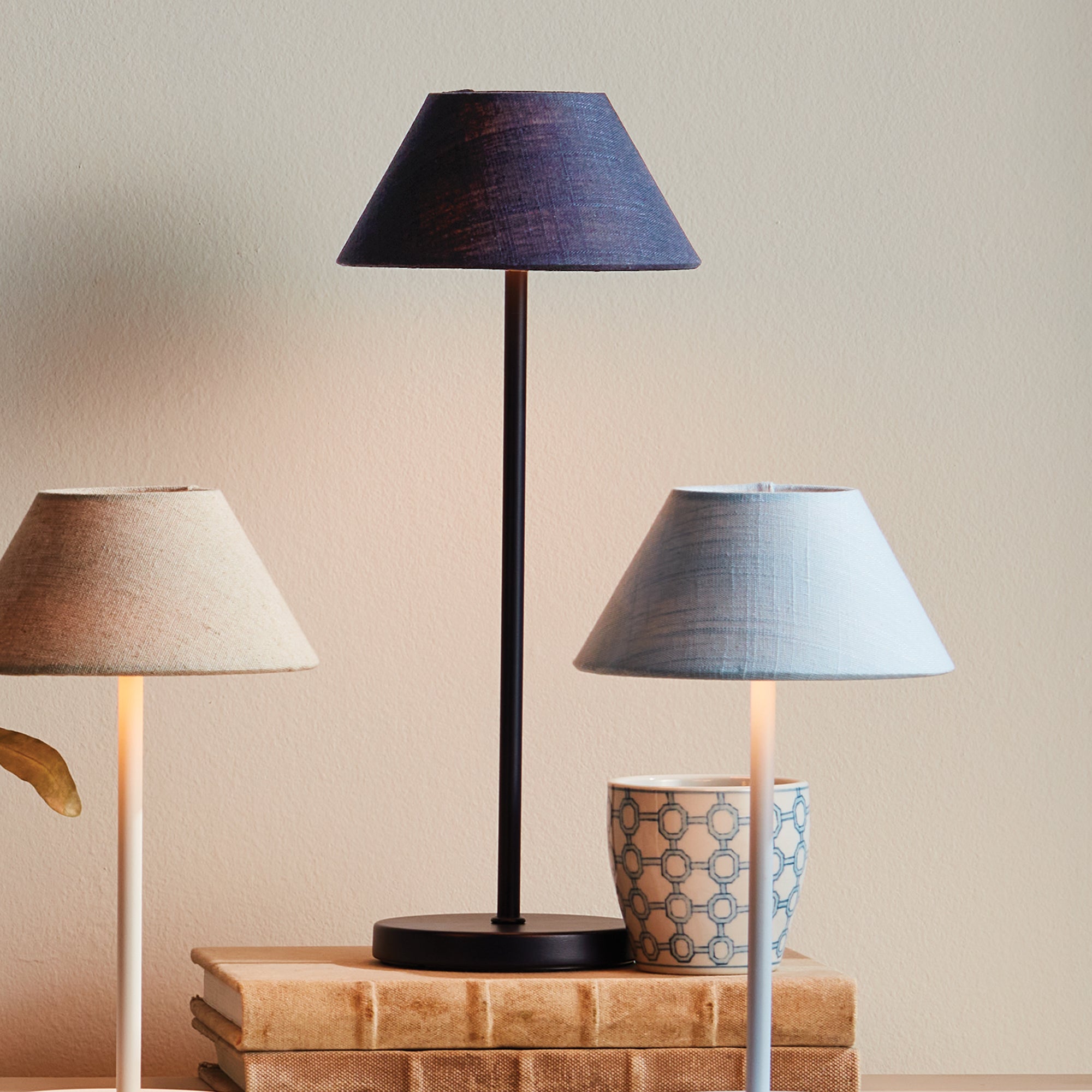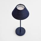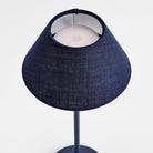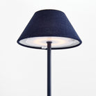 -Navy;-Easy touch On/Off and brightness settings: Candlelight (2200k), Warm White (2600k), Cool White (3000k);-Light longevity at full charge: 10 hours at full light intensity;-Total lumens: 200;-Charge time: 6 hours;-Charging station with USB- A cord included;-Shade material: linen;-IP44 rated for damp conditions