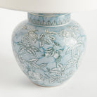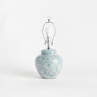 Featuring a hand-stamped, hand painted chinoiserie pattern on porcelain, this beautifully scaled profile is the perfect lamp for any room of the home. Designer-inspired, with a crystal base and 100% linen shade. On a side table, console or shelf, a stunning way to lighten up any setting.