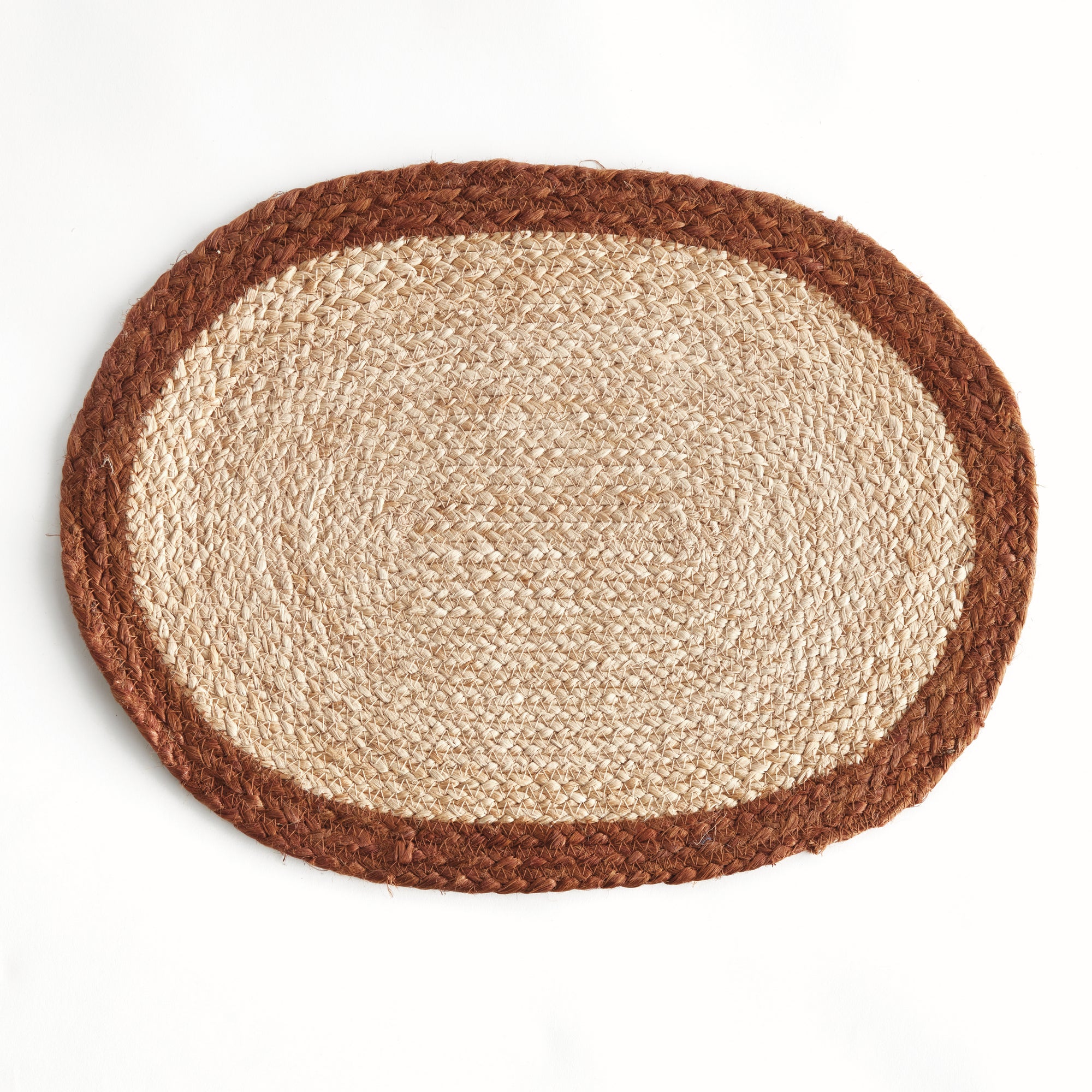 This set of eight oval placemats adds a natural element to your tablescape. Ideal for special occasions as well as everyday use. Each placemat is made of real jute, coil woven by a skilled artisan, and finished off with a dyed brown border. The thick weave adds a warm, welcoming feel. A simply perfect backdrop to any style of dinnerware.