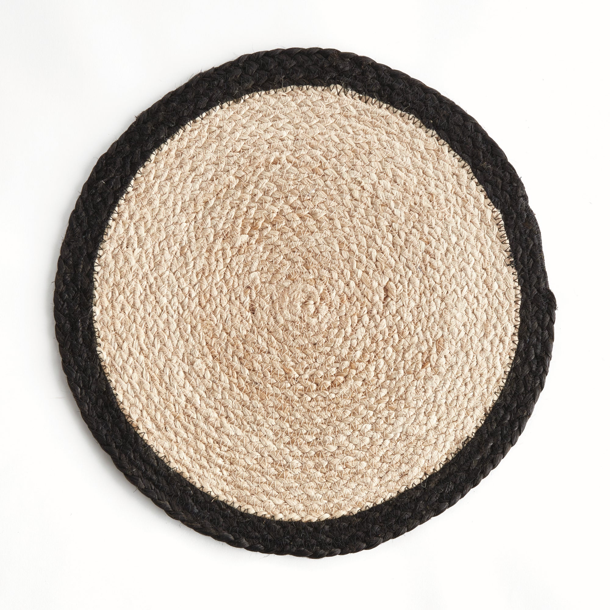 This set of eight placemats adds a natural element to your tablescape. Ideal for special evenings as well as everyday use. Each placemat is made of real jute, coil woven by a skilled artisan, and finished off with a dyed black border. The thick weave adds a warm, welcoming feel. Each placemat measures 15" round, to easily accommodate plates of all sizes.