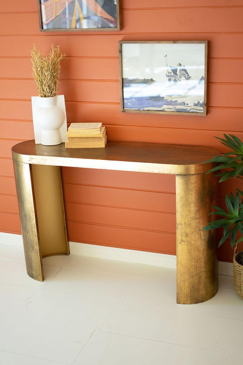 Complete your look with this oval antique brass console table. The sturdy design and shiny finish make this piece stand out as an entryway table, a beautiful vanity table, or a space-saver in a bedroom or guest space.