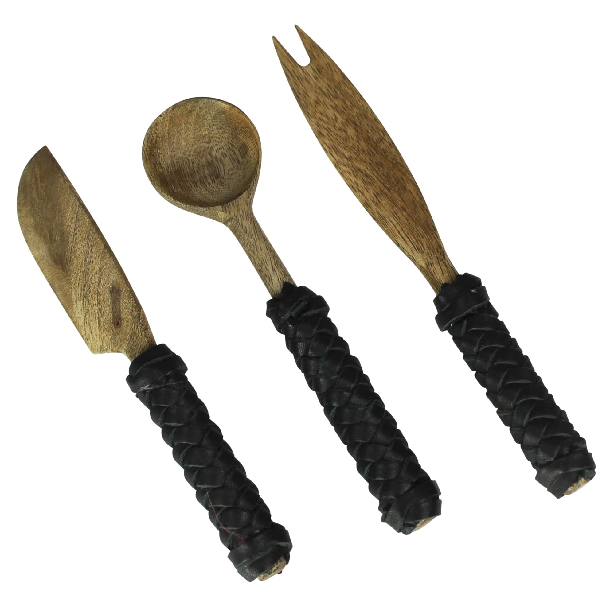 Richly grained mango wood is hand carved into minimal yet functional serving pieces with genuine leather handles. Hand wash is recommended. Handwash Only