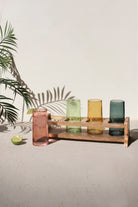 For craft cocktails, try these four cocktail glasses and tray set. It comes with one of each color on a wooden base. Entertain, show off your bartending skills, or try bunches of each brand.
