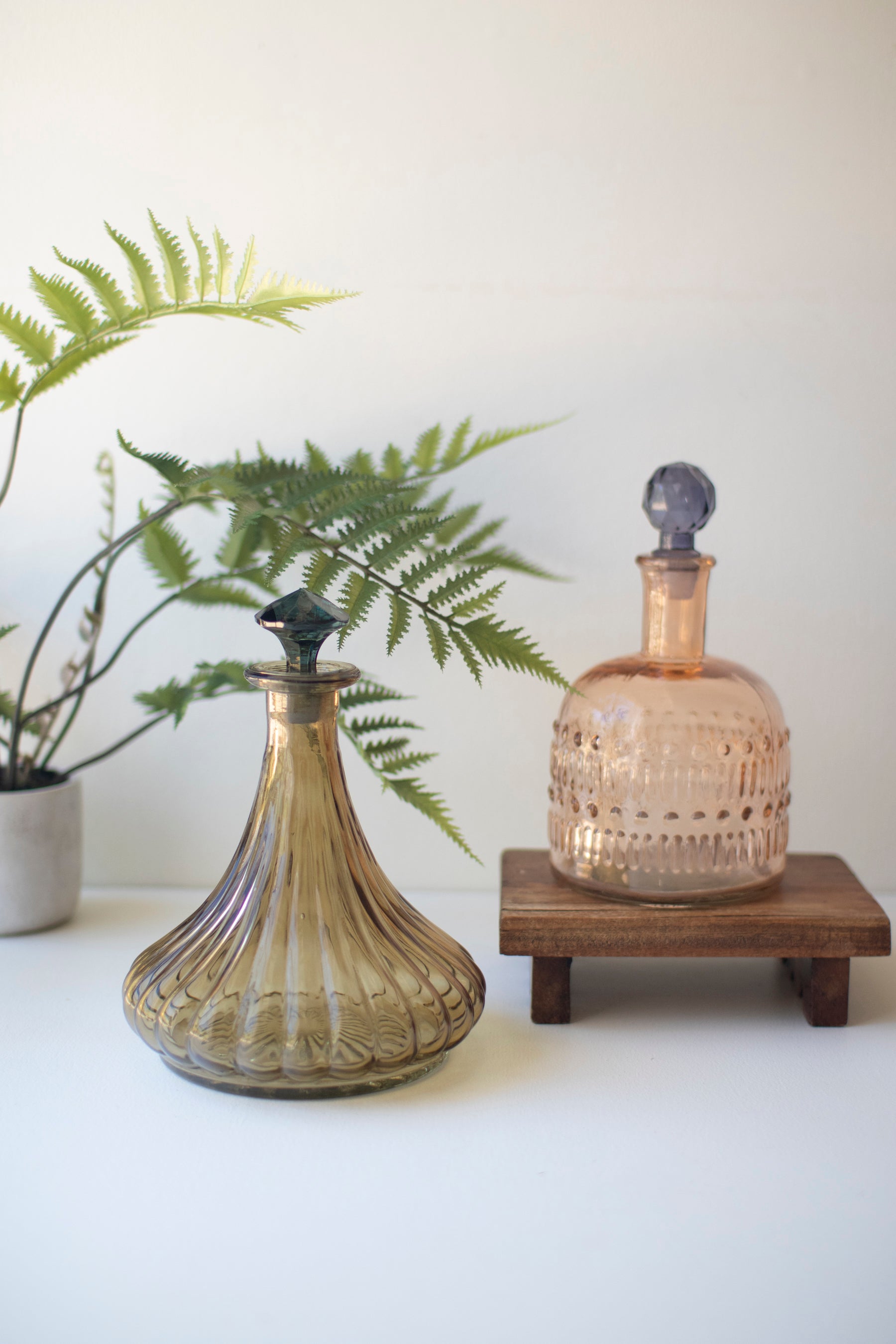 This beautiful set includes two glass decanters in one of each design. Use them for shelf or desk decor in an office that needs a little pizzazz. Gift one or both to brighten someone's day. Does not have a rubber stopper/seal. Stoppers are not interchangeable.