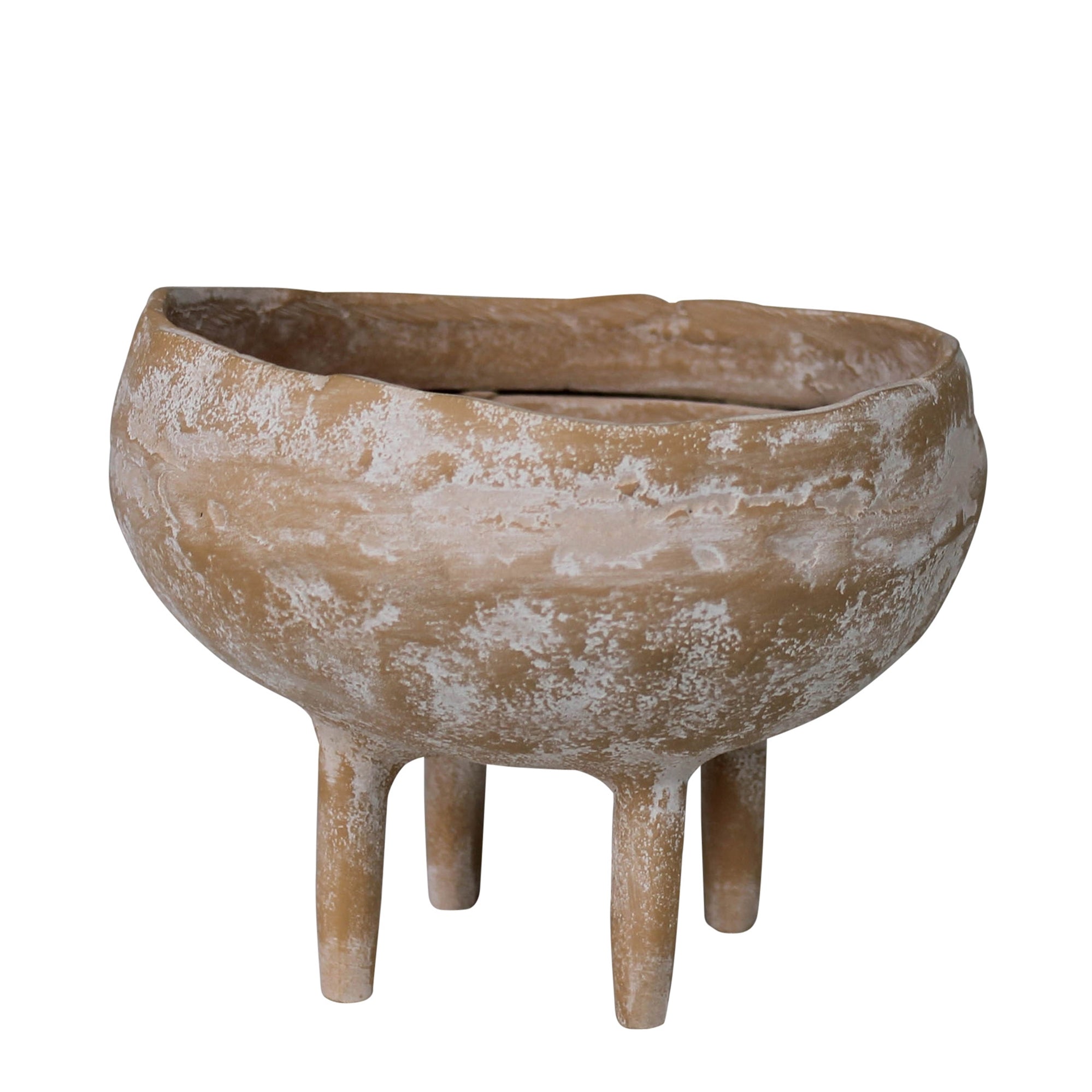 Cast of aluminum with a washed terra cotta finish this footed bowl is ready to be planted with an arrangement, elevated high on it's four long legs. Water tight. For decorative use only.