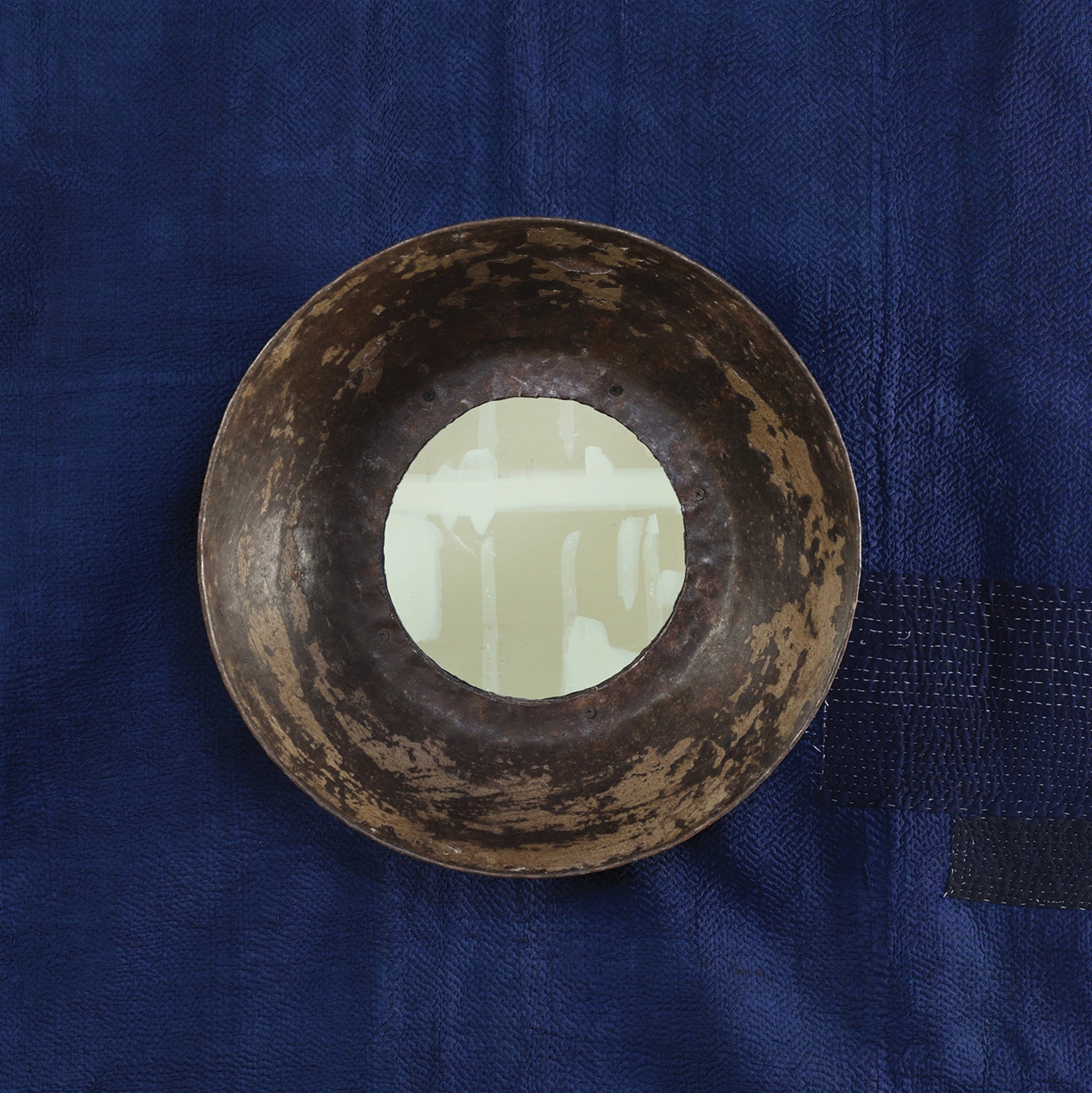 Salvaged Metal Bowls, which were once used for the transport of rocks and soil, are given a break from the heavy lifting and turned into a concave form for a mirror. Each piece is unique, shapes, sizes and finish will vary.
