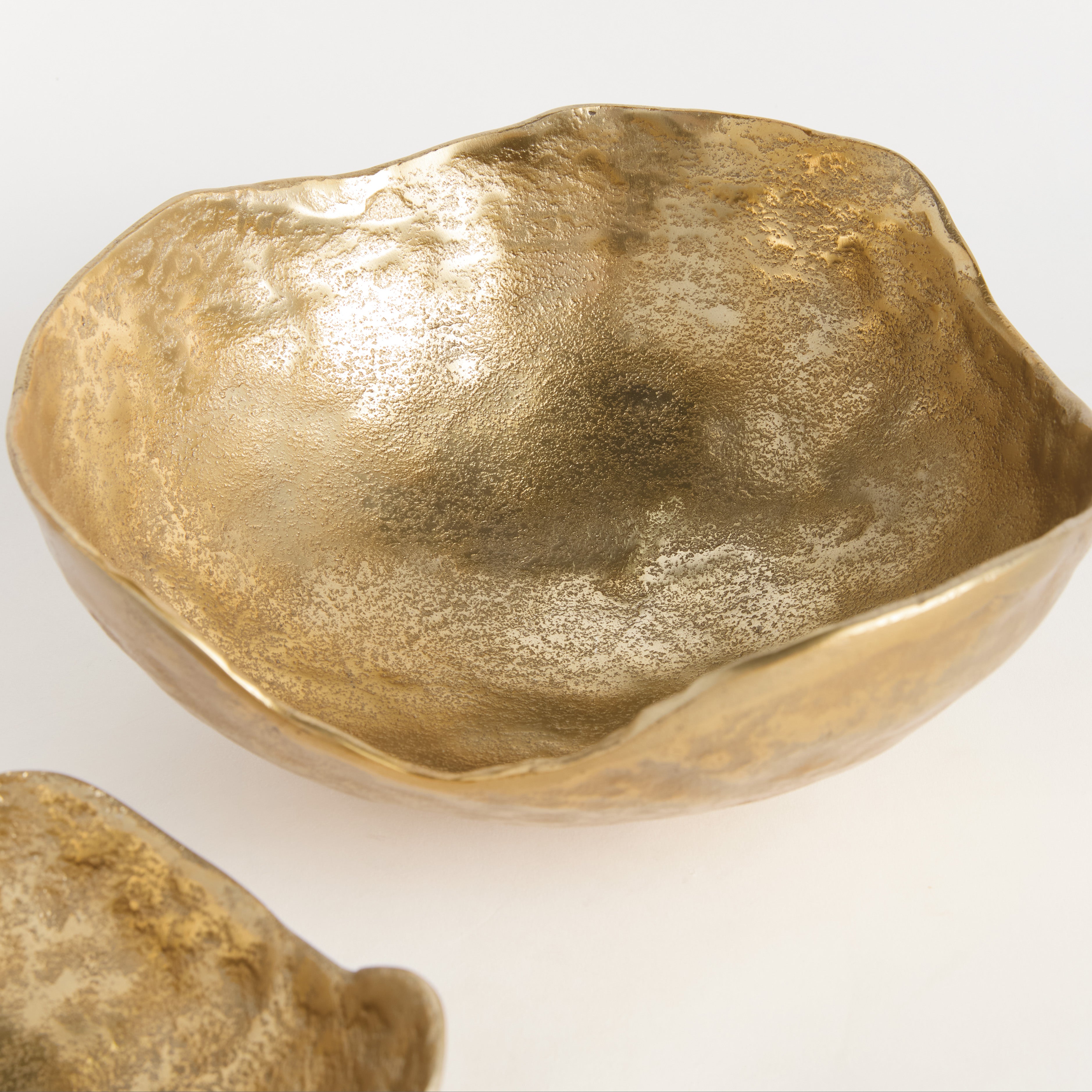 These organic decorative, hand-sculpted bowls are made to be on display. With a golden finish and irregular edge, styled or just as they are, a strong statement for the modern space. The epitome of functional art.