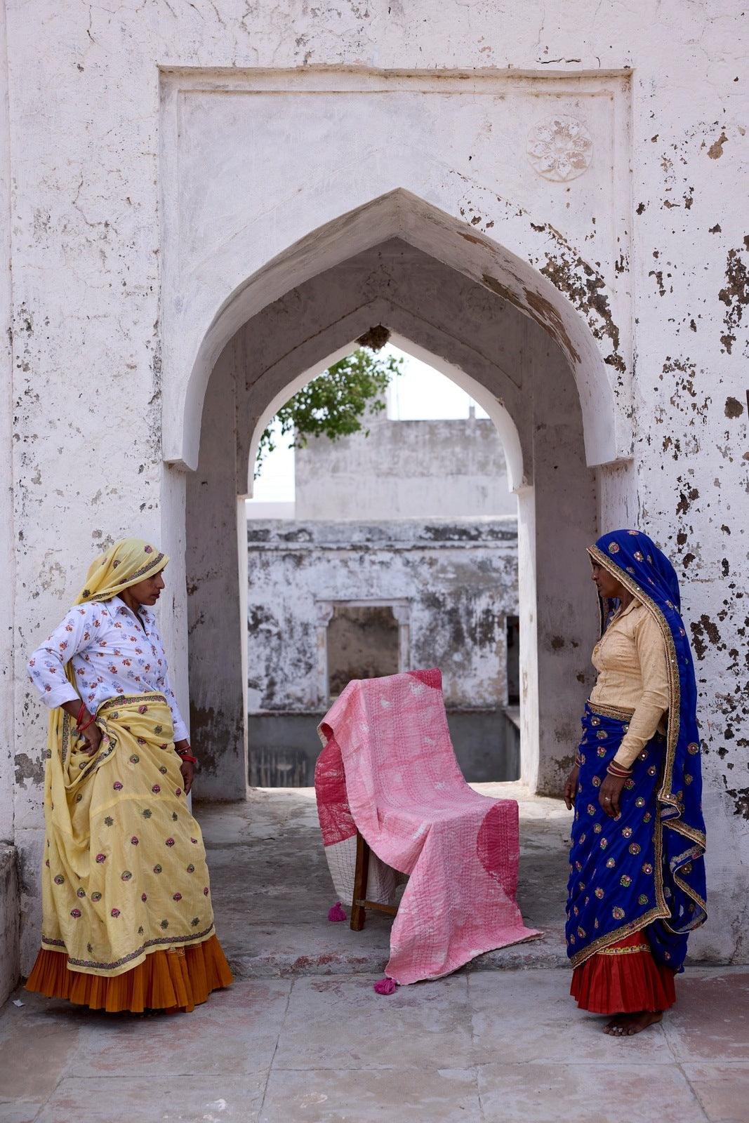 The design is hand-pressed onto pure cotton using hand-carved wooden blocks dipped in dyes. The printed cotton is brought to the homes of Kantha quiltmakers, who hand-stitch the cotton sheet onto a cotton base to create the final throw.