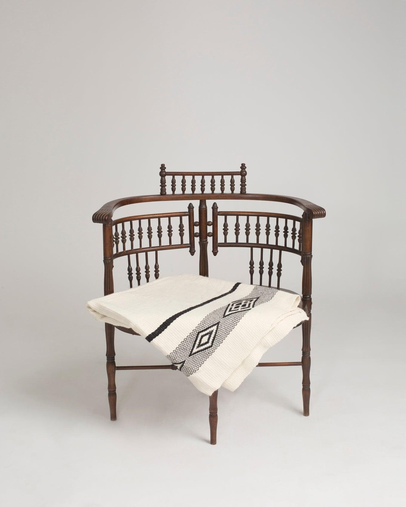 VOZ' handloomed Textile Diagonal Blanket is handwoven in lush baby alpaca by master Mapuche artisans of Southern Chile. This design doubles as the perfect throw blanket or indulgently dramatic shawl. It features a sacred symbolic sequence depicting the eye of the Goddess, intercultural interconnectedness, and our collective connection to Mother Earth. This weaving masterpiece can take over a month to weave by our expert weavers