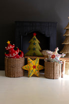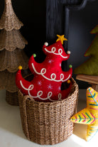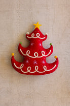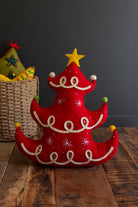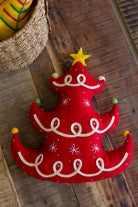 This red felt Christmas tree pillow makes a great pair with the green version or others in the set. It has a yellow topper and icing stripes with lights on branches. Add one to any space this Christmas. One sided.