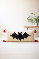Have a hand-hooked Halloween. This Indian hand-hooked bat pillow proclaims your Halloween spirit. Black bat wings spread across the front and orange tassels top the corners. 100% Wool Front/100% Cotton Back/100% Polyester Insert Removeable insert. Zipper closure. Finished with Orange Tassels.