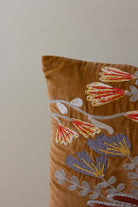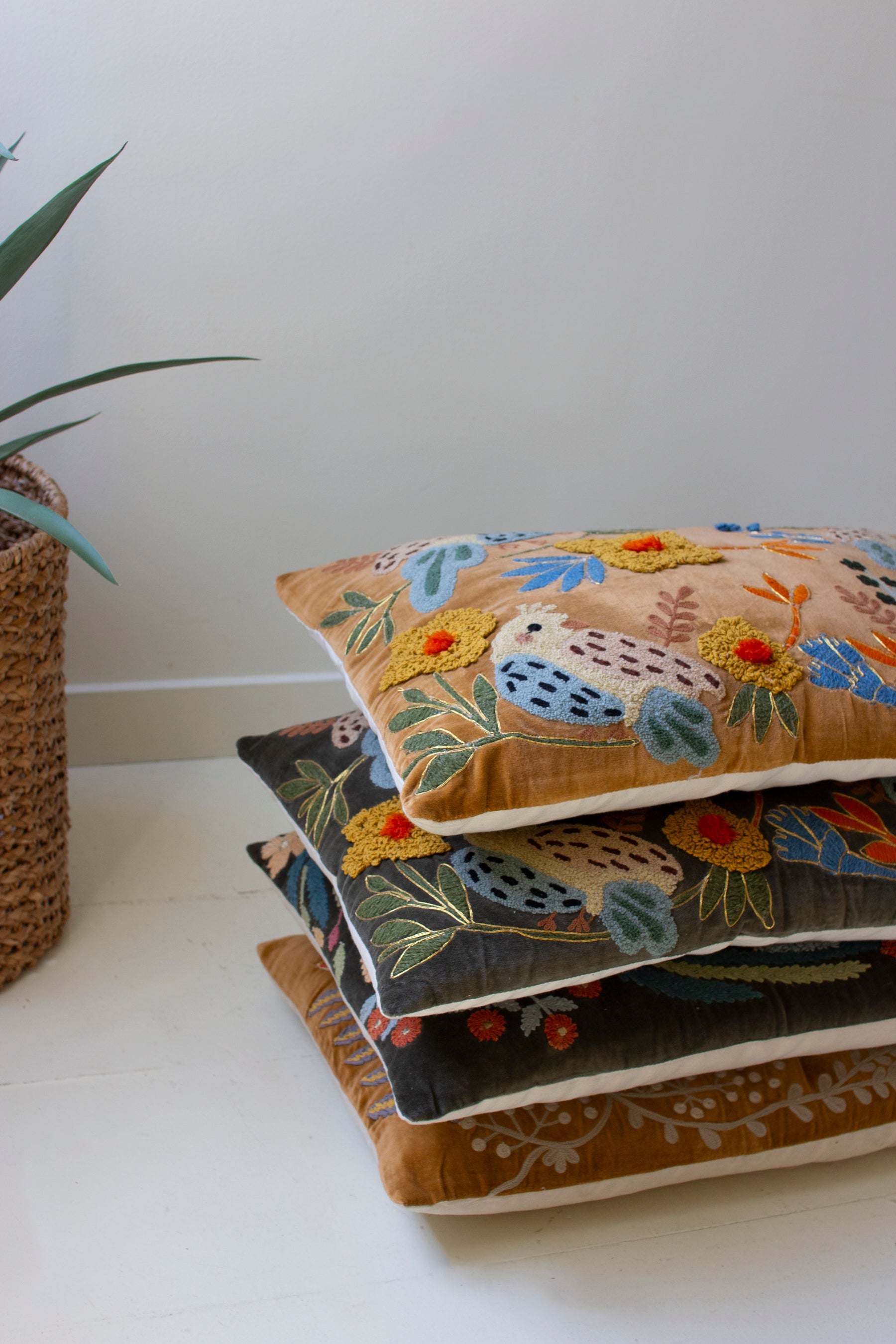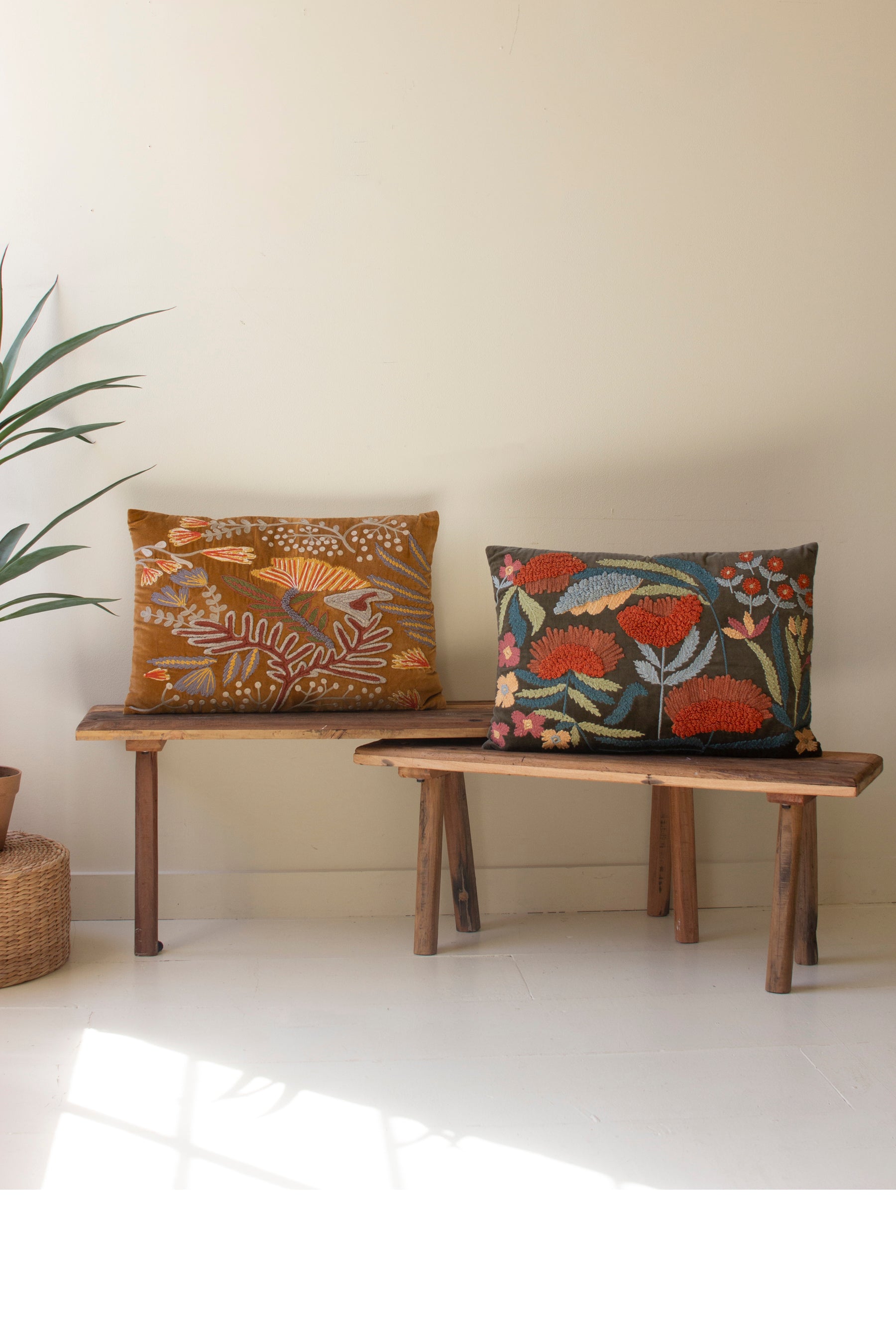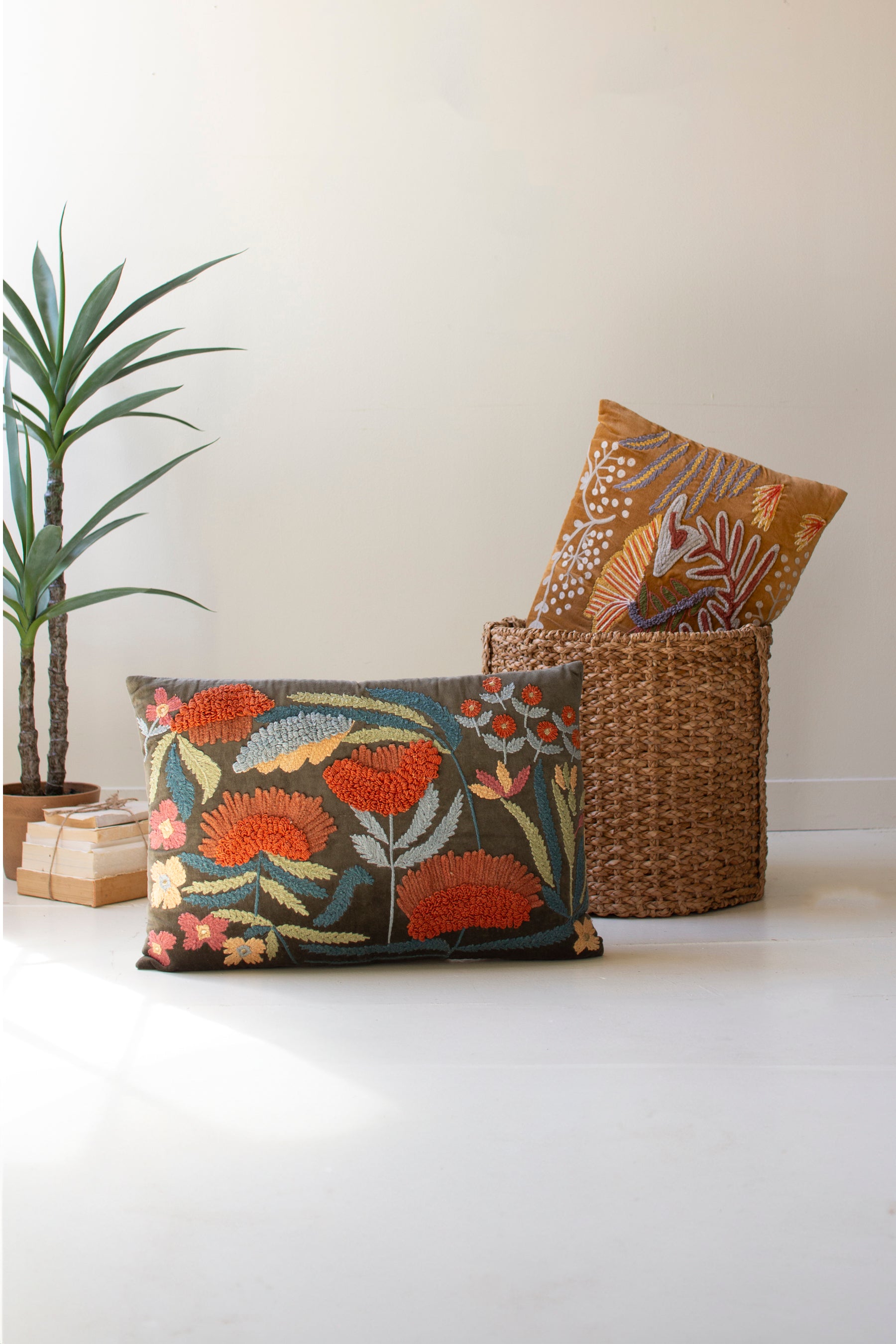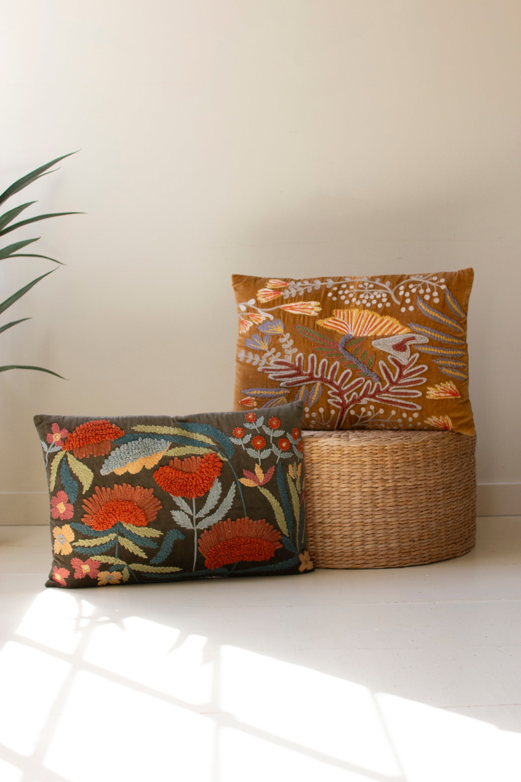 Snuggle up to this set of two embroidered pillows with flowers. The set includes one of each color and is made in India. Mix and match or split the set. Hooked thread detail. Zipper in back. One sided.