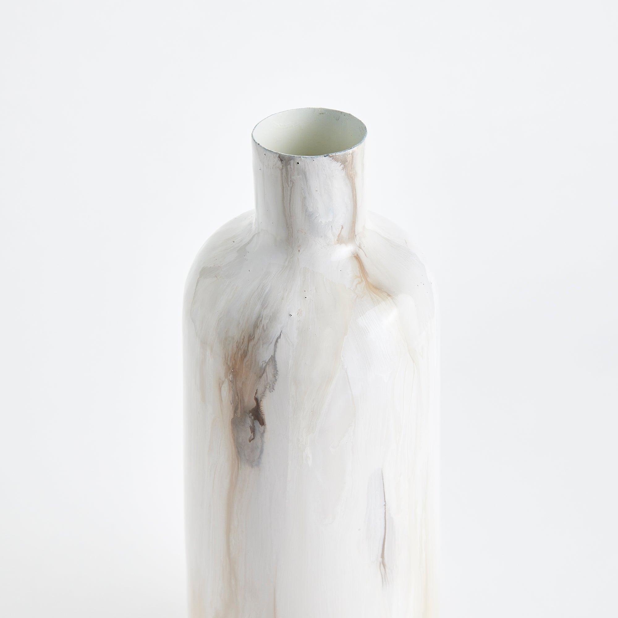 In a clever use of enameled iron, this lightweight decorative vase is painted by hand. With a creamy mocha palette inspired by a latte, with layers of milky froth and coffee tones swirling, it is modern artistry defined.
