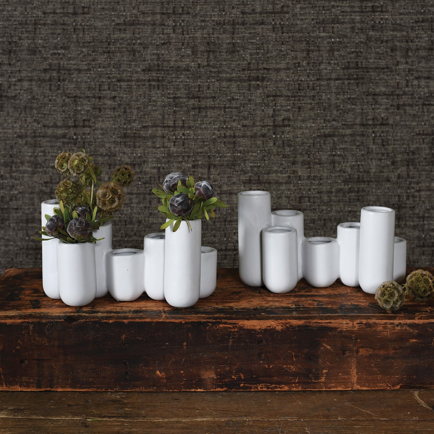 An amalgamation of inspiration – test tube meets sea creature – with just a few buds, twigs and pods our Luna Bud Vase Cluster creates an on-the-spot arrangement. Crafted of ceramic in a matte-white glaze this vase is sure to capture curiosity. Wipe with damp cloth, Wipe with light detergent For Decoration Use Only - Do Not Use for Food