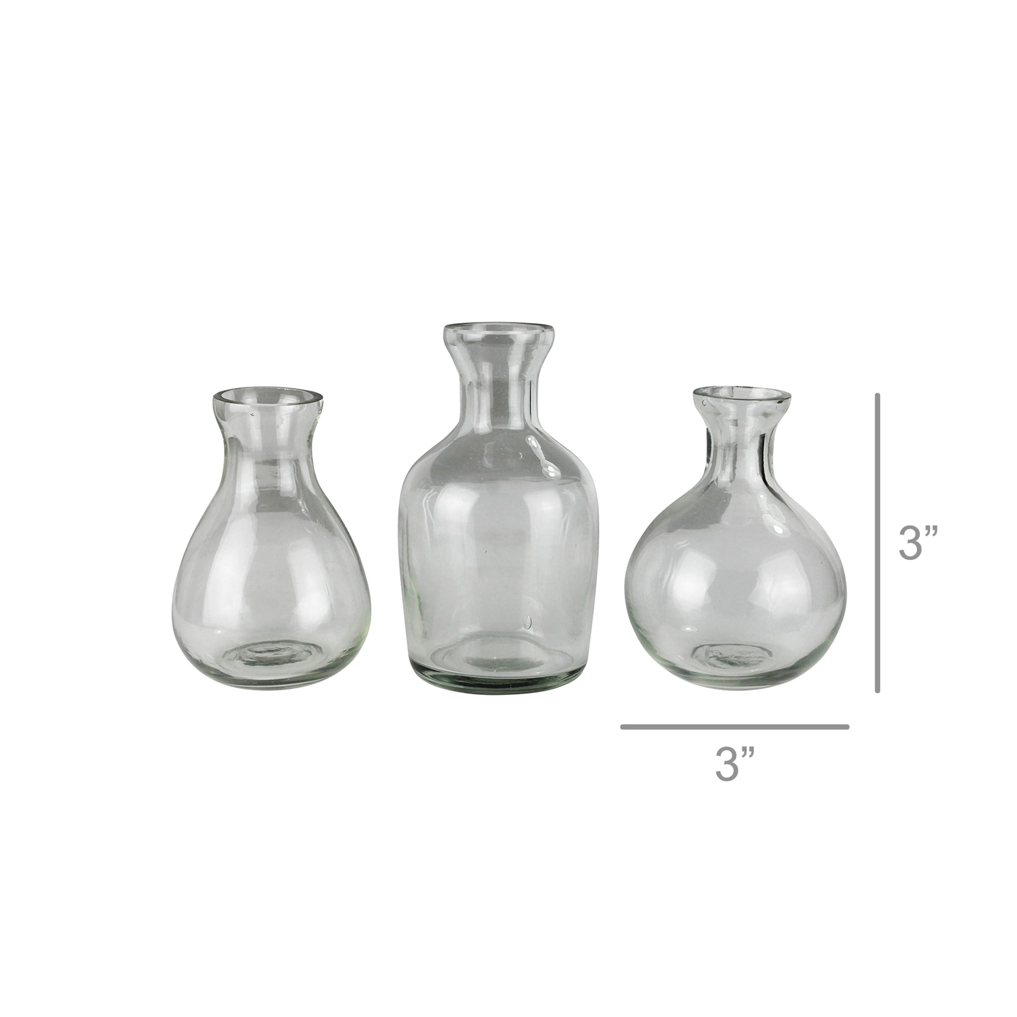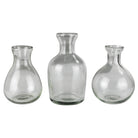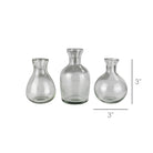 This trio of glass vases each with their own profile, unify as a singular grouping when filled with floral. 3x3x4, 2.75x2.75x4, 2.5x2.5x4.75 (Set of 3: $5, $5.25, $5.75)