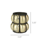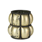 Iron frames are blown into with hot glass, forever encasing the bulbous shapes. Given an antique gold finish with subtle distressing, candlelight glows through each marking. Equally as striking with a floral arrangement.
