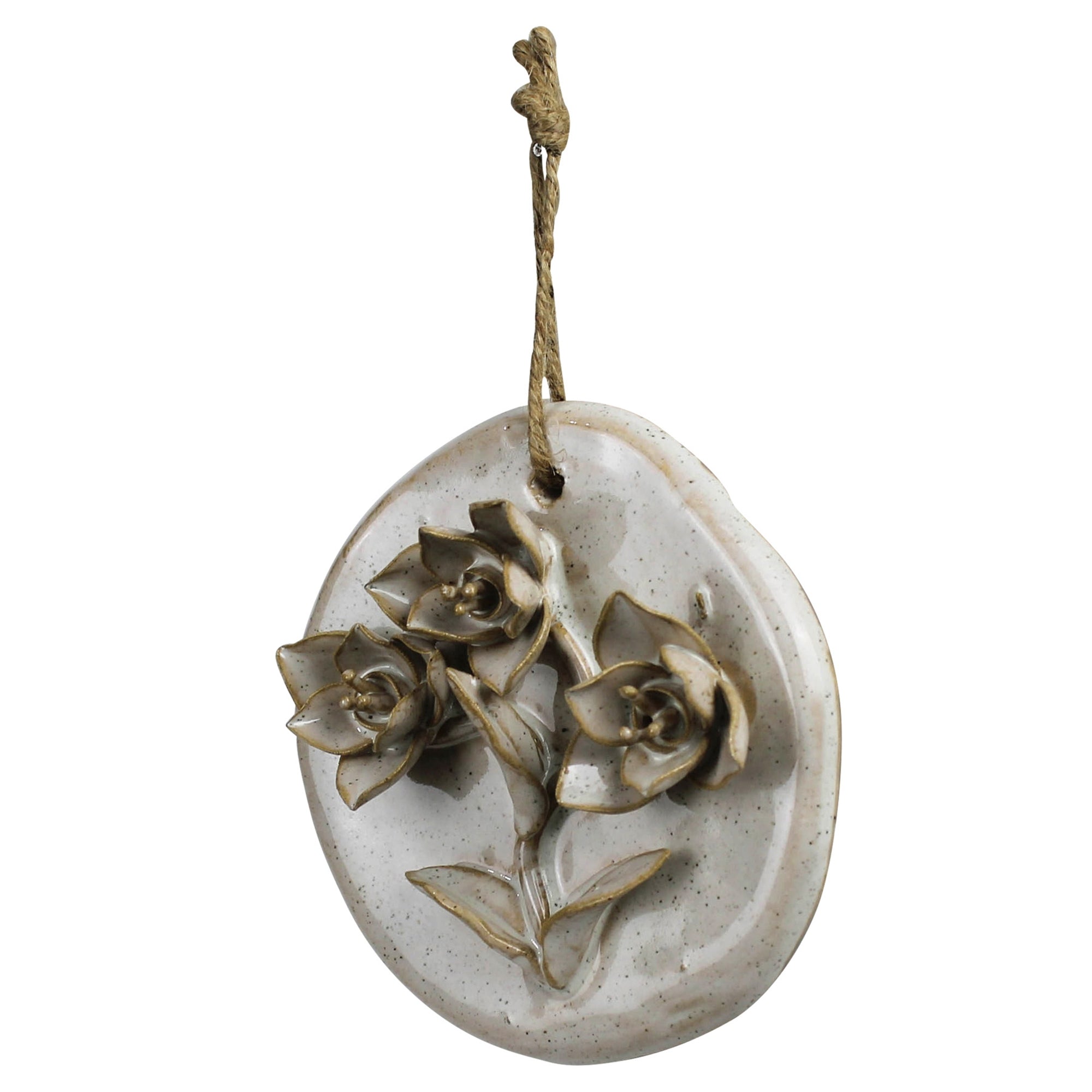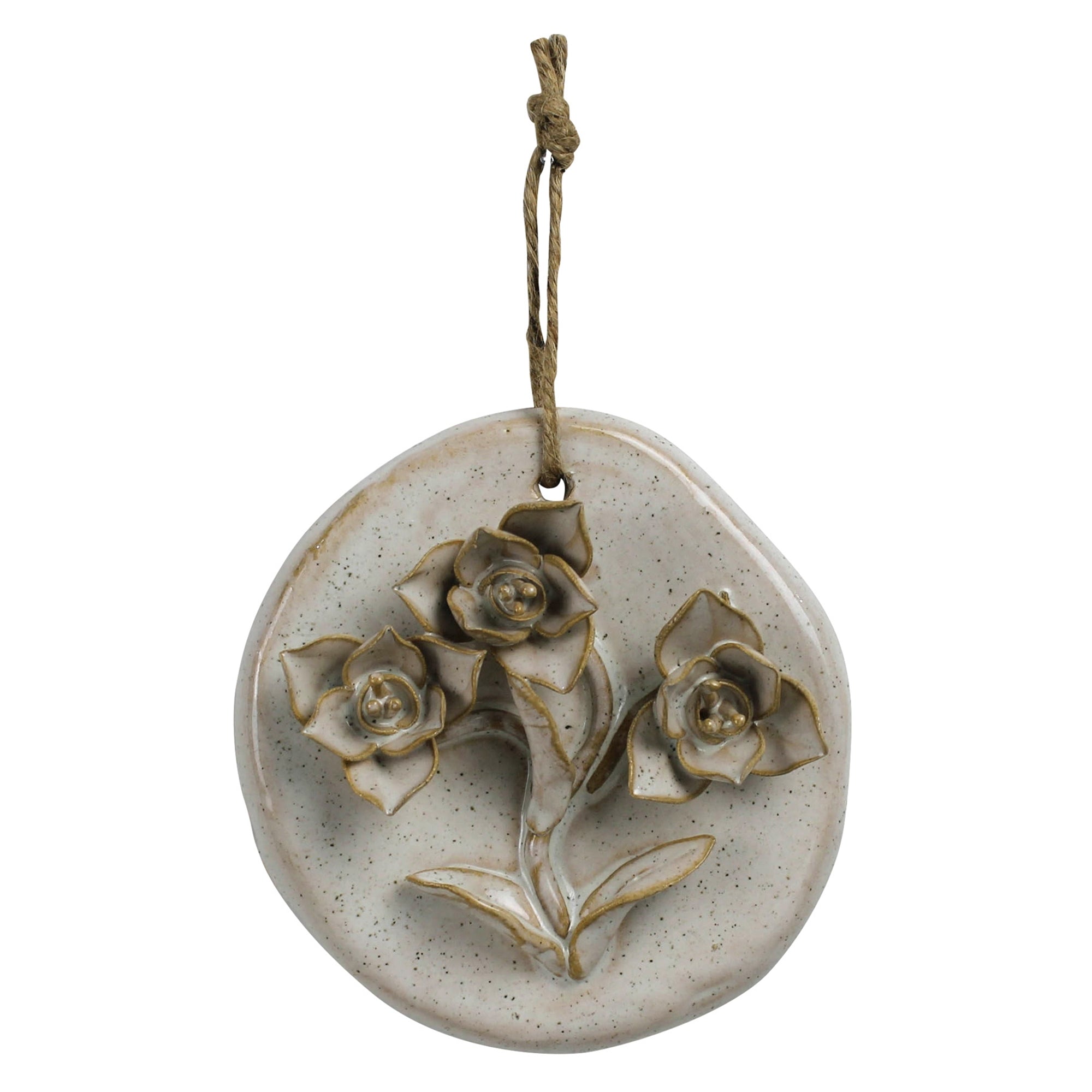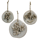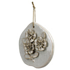 Handmade ceramic blooms mounted on organically shaped surfaces come together as a sweet trio of wall art for either indoors or out. Sm: 4x1x4, Med: 5x1x5, Lrg: 6x1x6