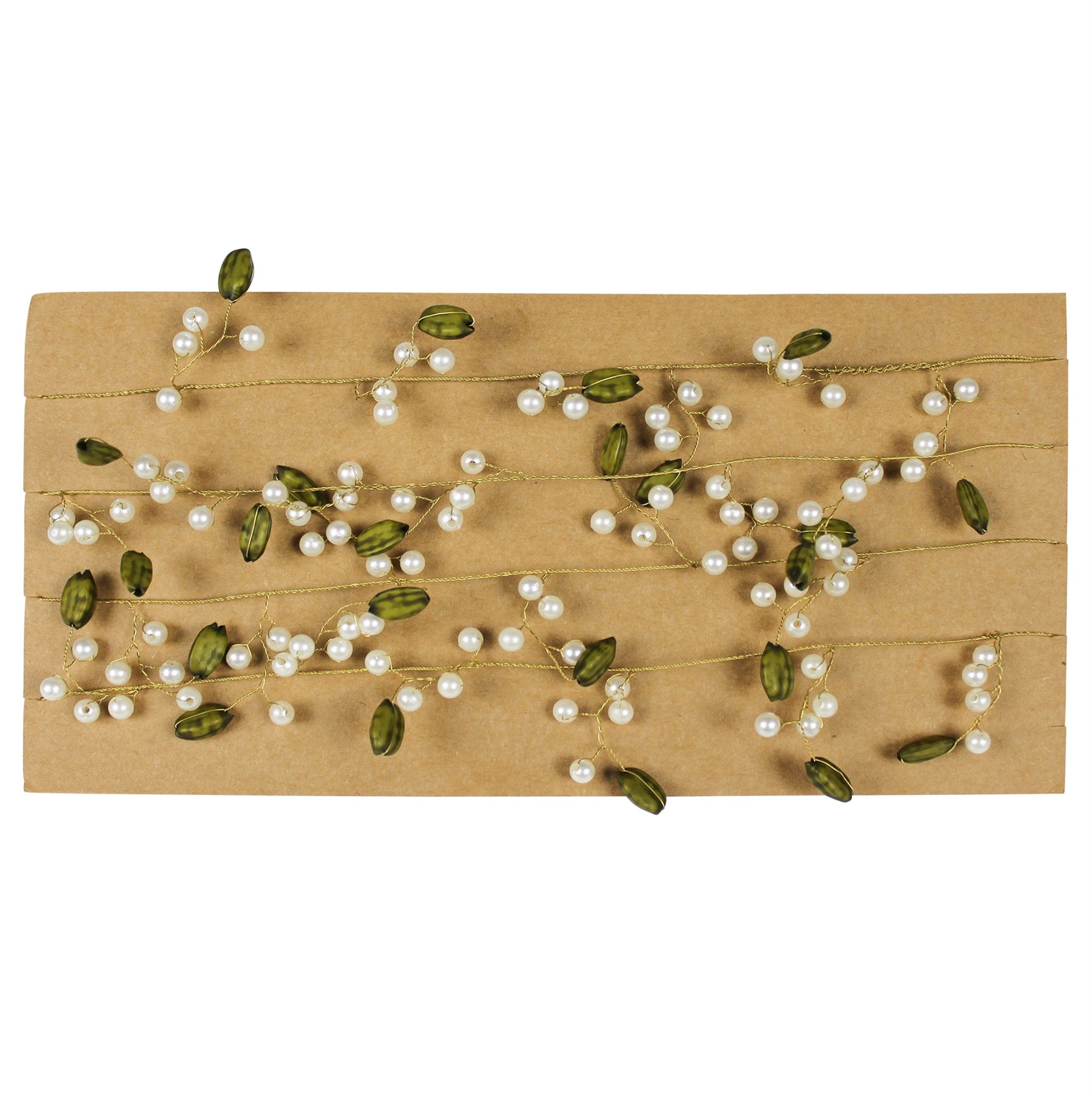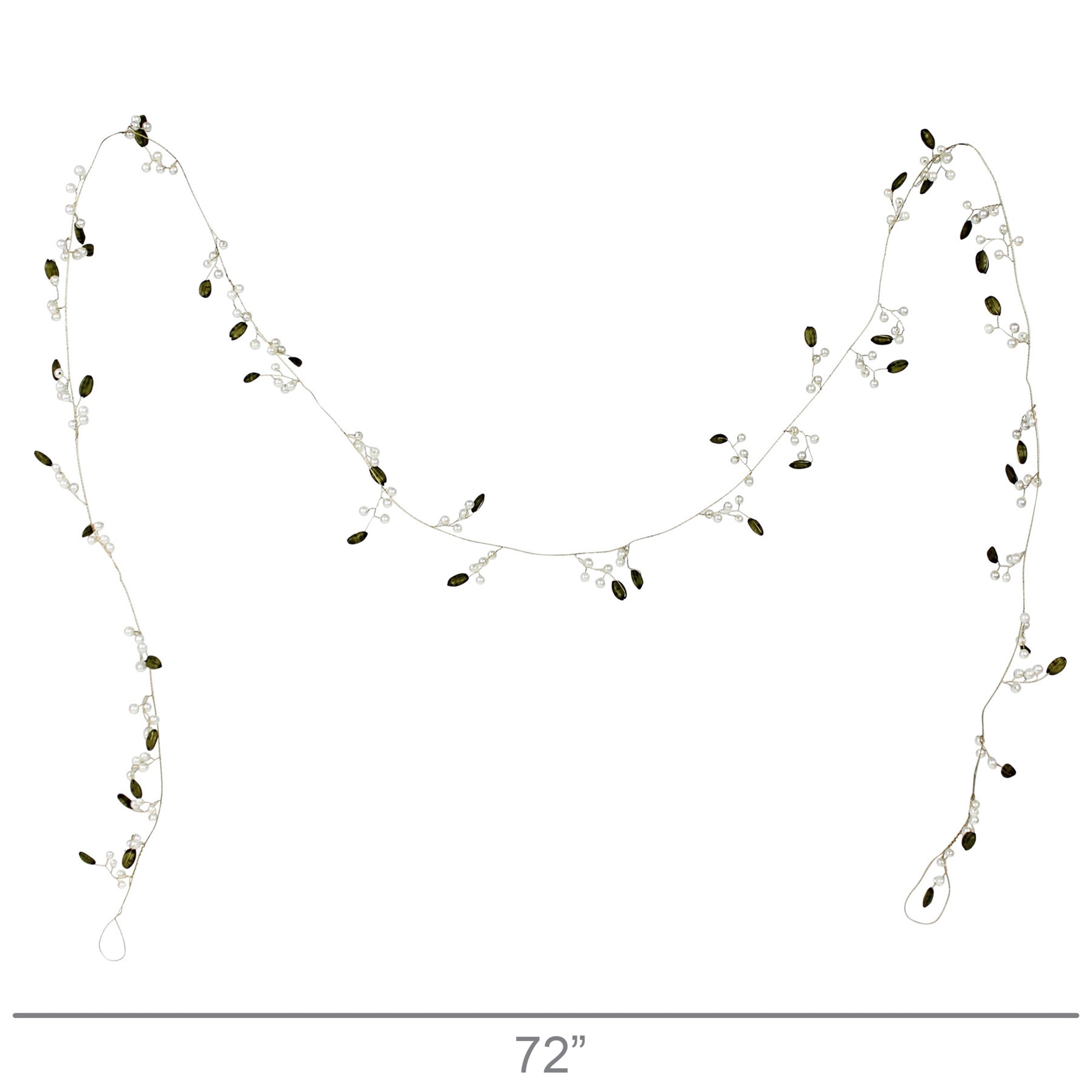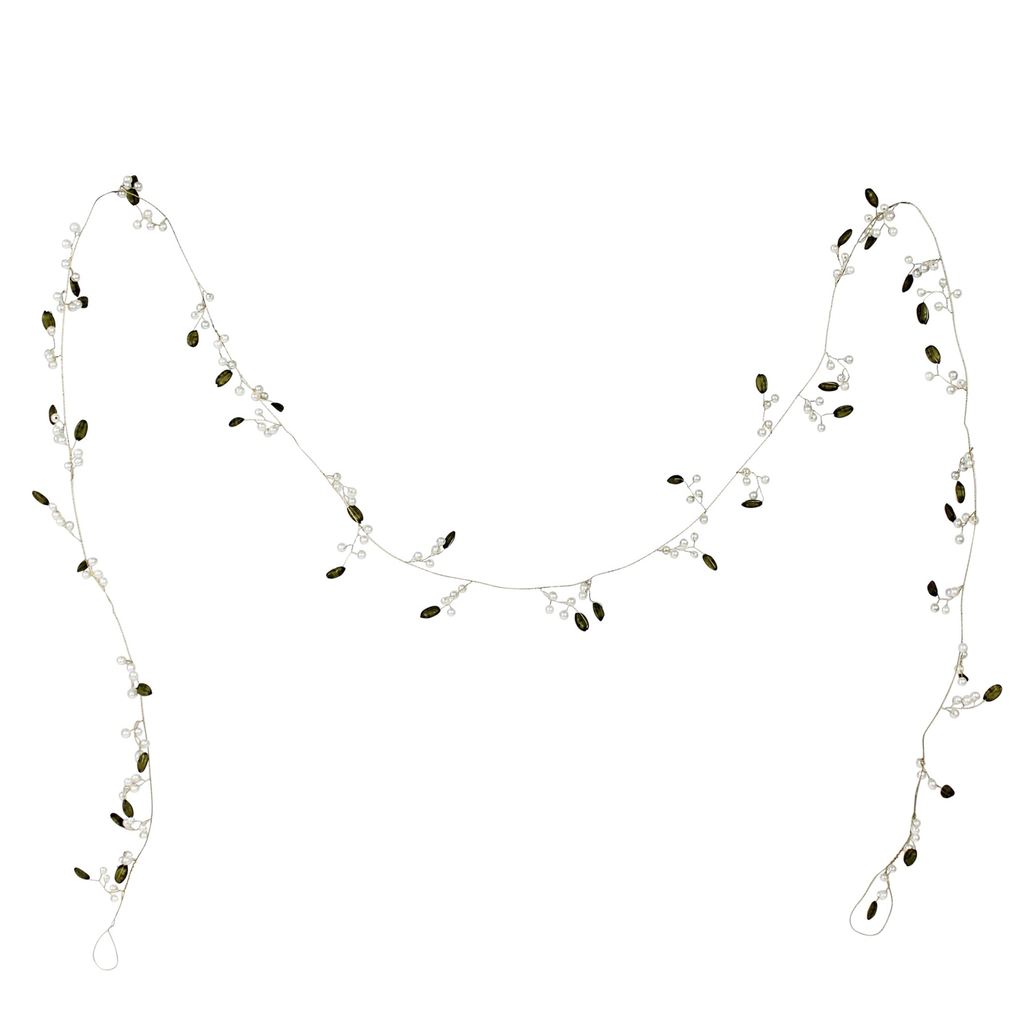 Tiny pearls and green pods are string together on brass wire creating a truly magical garland to encircle a tree, lay atop a mantle or run down the center of a table.