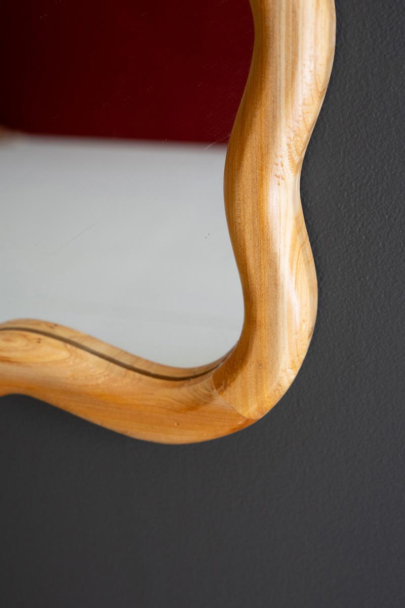 This mirror's got the squiggles. The large rectangular mirror with a wiggly frame is a whimsical addition to children's areas but sophisticated enough for the dining room. The natural wood frame blends easily with both neutral and colorful walls.