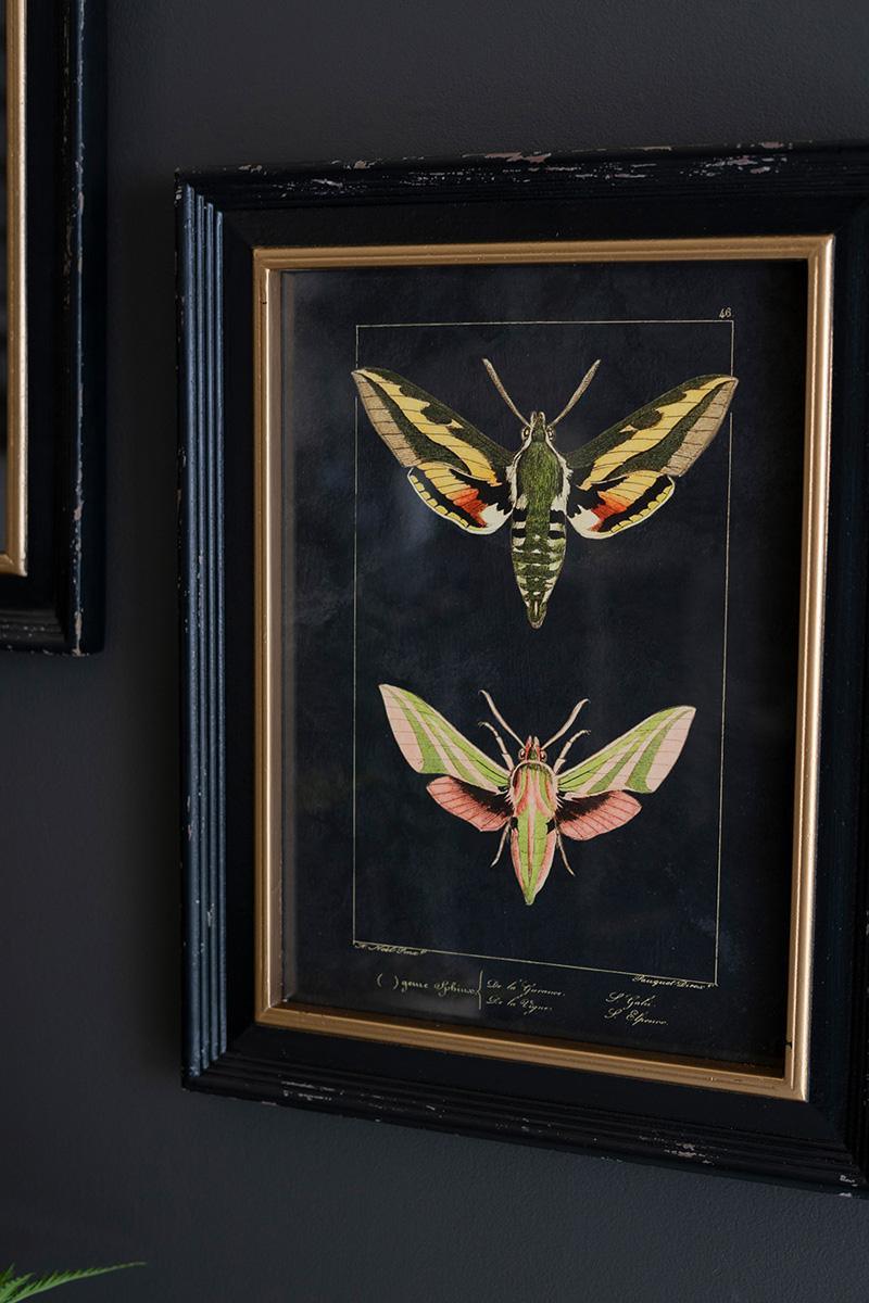 Exercise your inner entomologist with this set of framed moth prints under glass. Black frames bring out the intense colors of this pair of prints featuring four moths. This set suits a manly office, woodland retreat, and anywhere curiosity is cultivated.