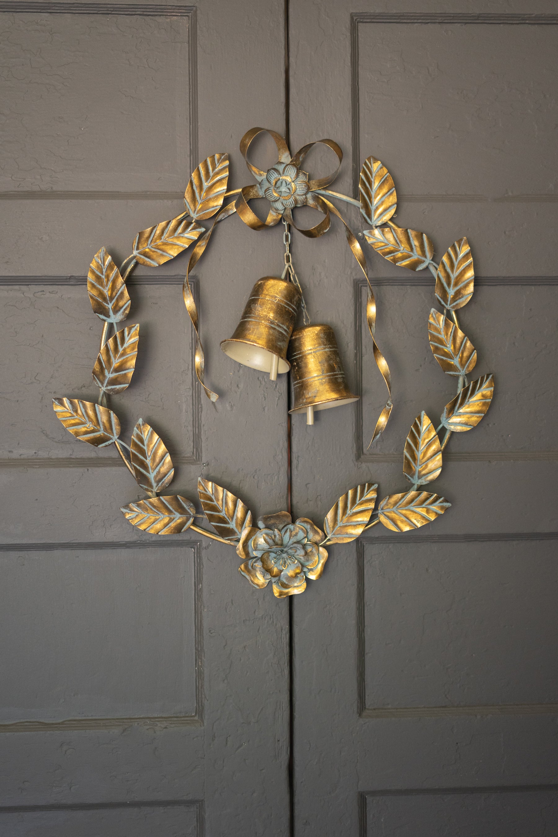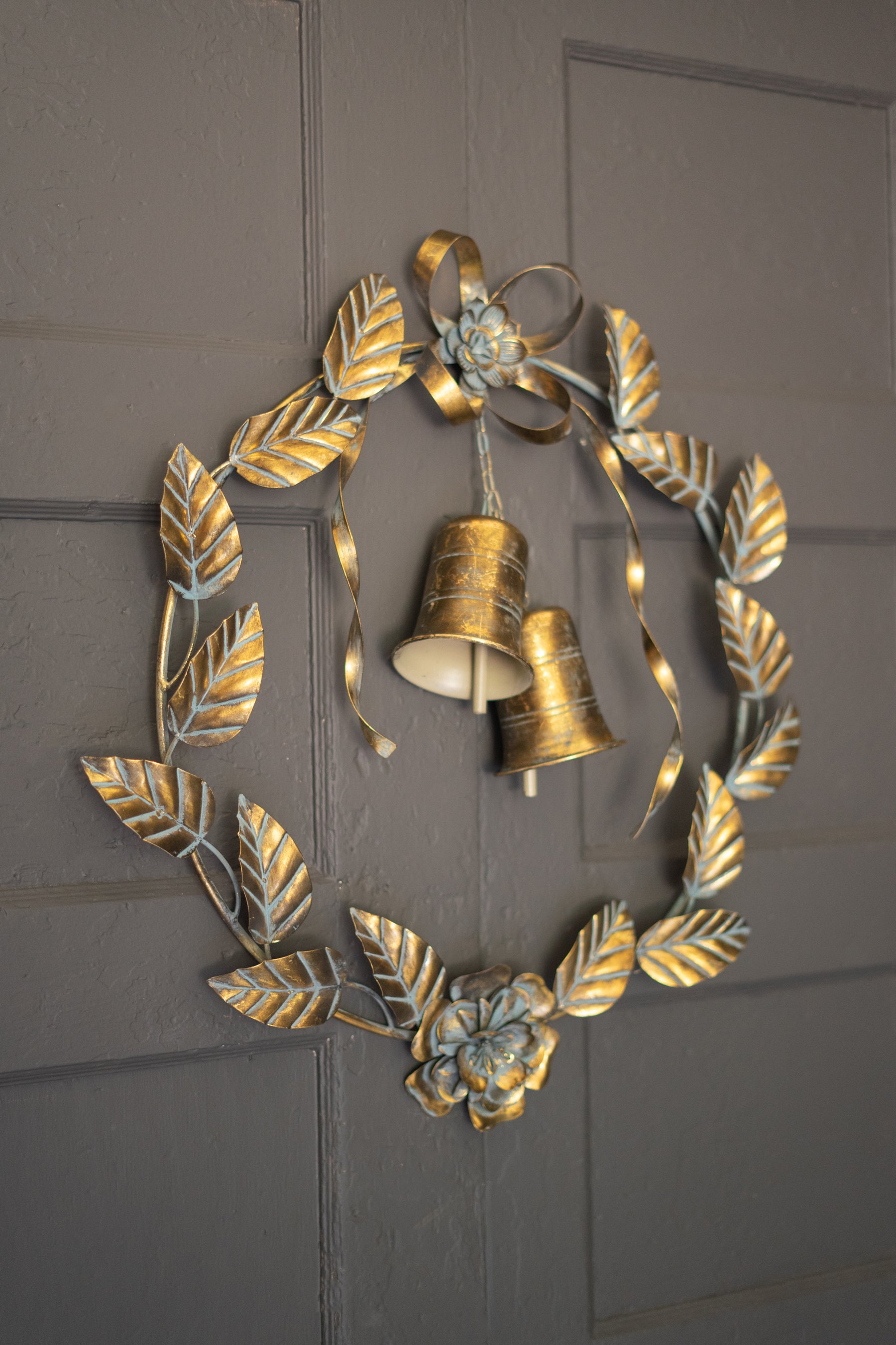 Antique brass leaves make up this Christmas door wreath with bells in the middle. Hang this beauty on your front door or guests' quarters for a festive holiday addition. This piece shines against neutral or colorful backdrops. 1 keyhole hanger. Bells are working and has movement.