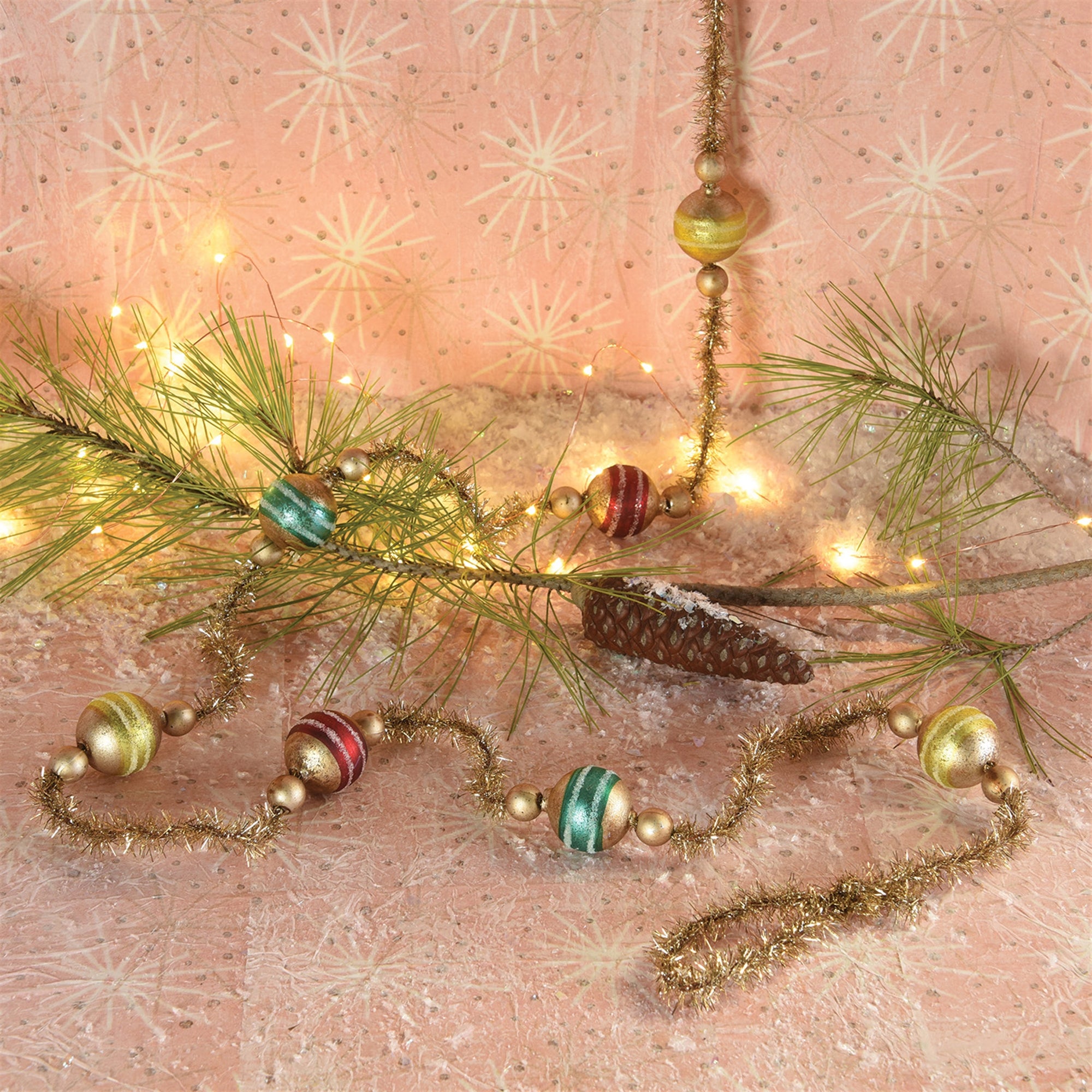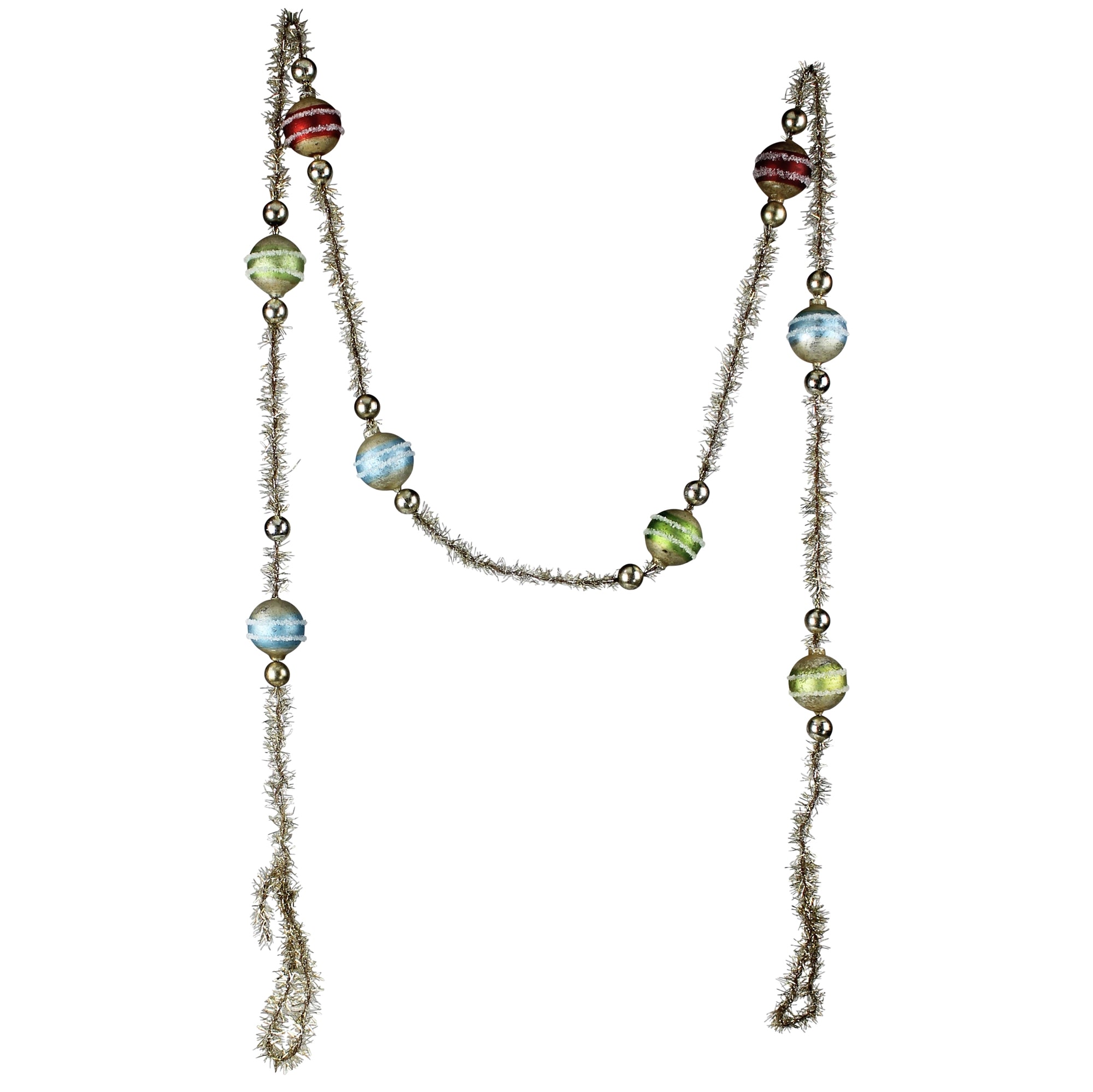 Spark the wonder of holiday nostalgia anew with our vintage inspired glass and tinsel garland in a sweet holiday color palate. 6' long