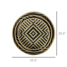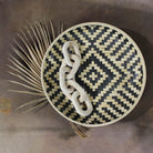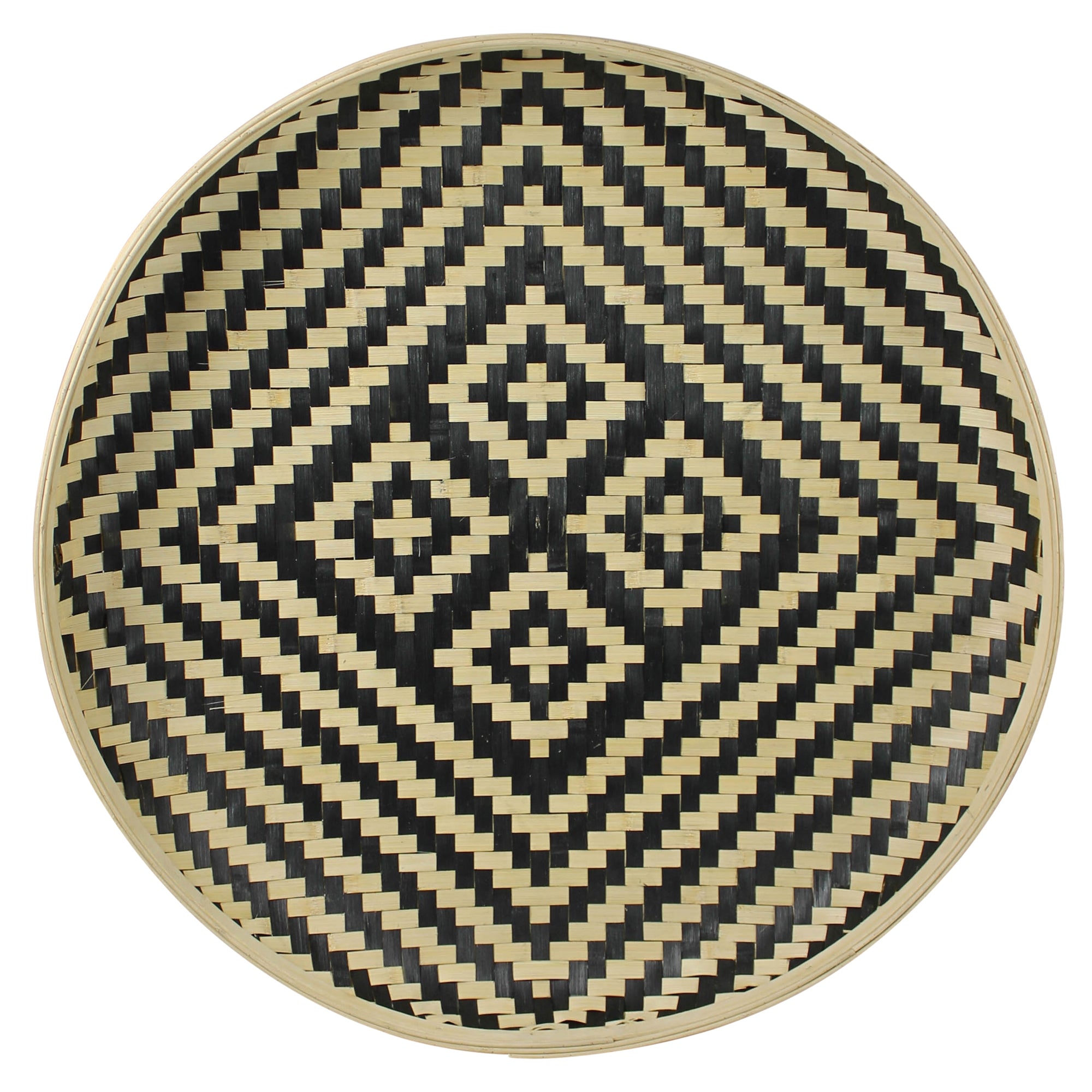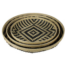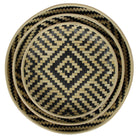 Strips of rattan are woven into graphic patterns create an impactful visual statement in this set of three baskets. With their low profile they are suitable to be hung on a wall or used on a tabletop in a clustered array. Set of 3: $26, $32, $40, Sm: 22x22x2.75, Med: 19x19x2.5, Lrg: 25.5x25.5x3