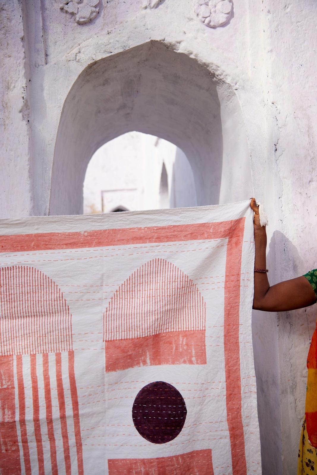 The design is hand-pressed onto pure linen using hand-carved wooden blocks dipped in dyes. The printed linen is brought to the homes of Kantha quiltmakers, who hand-stitch the linen or cotton sheet onto a cotton base to create the final throw.