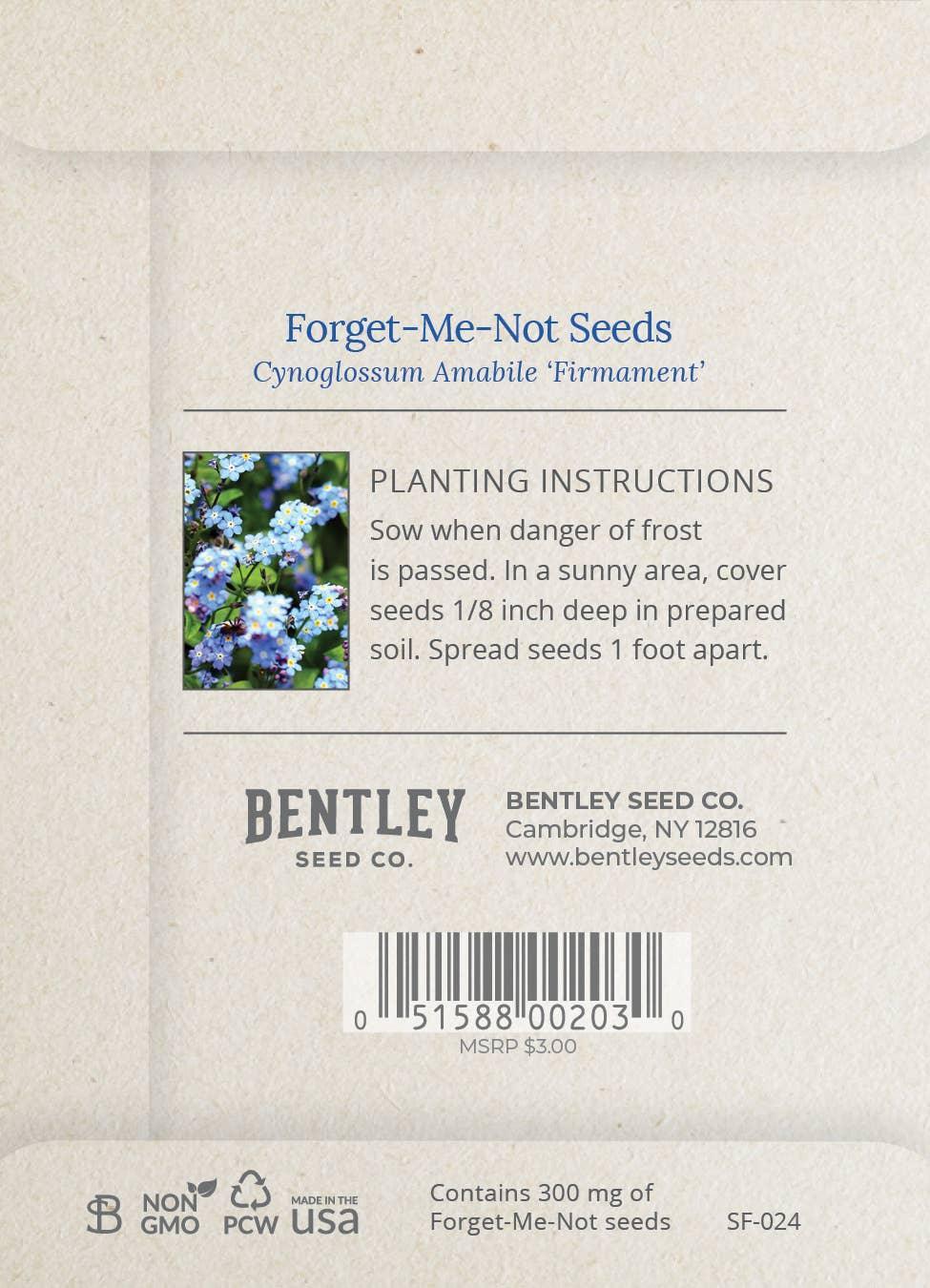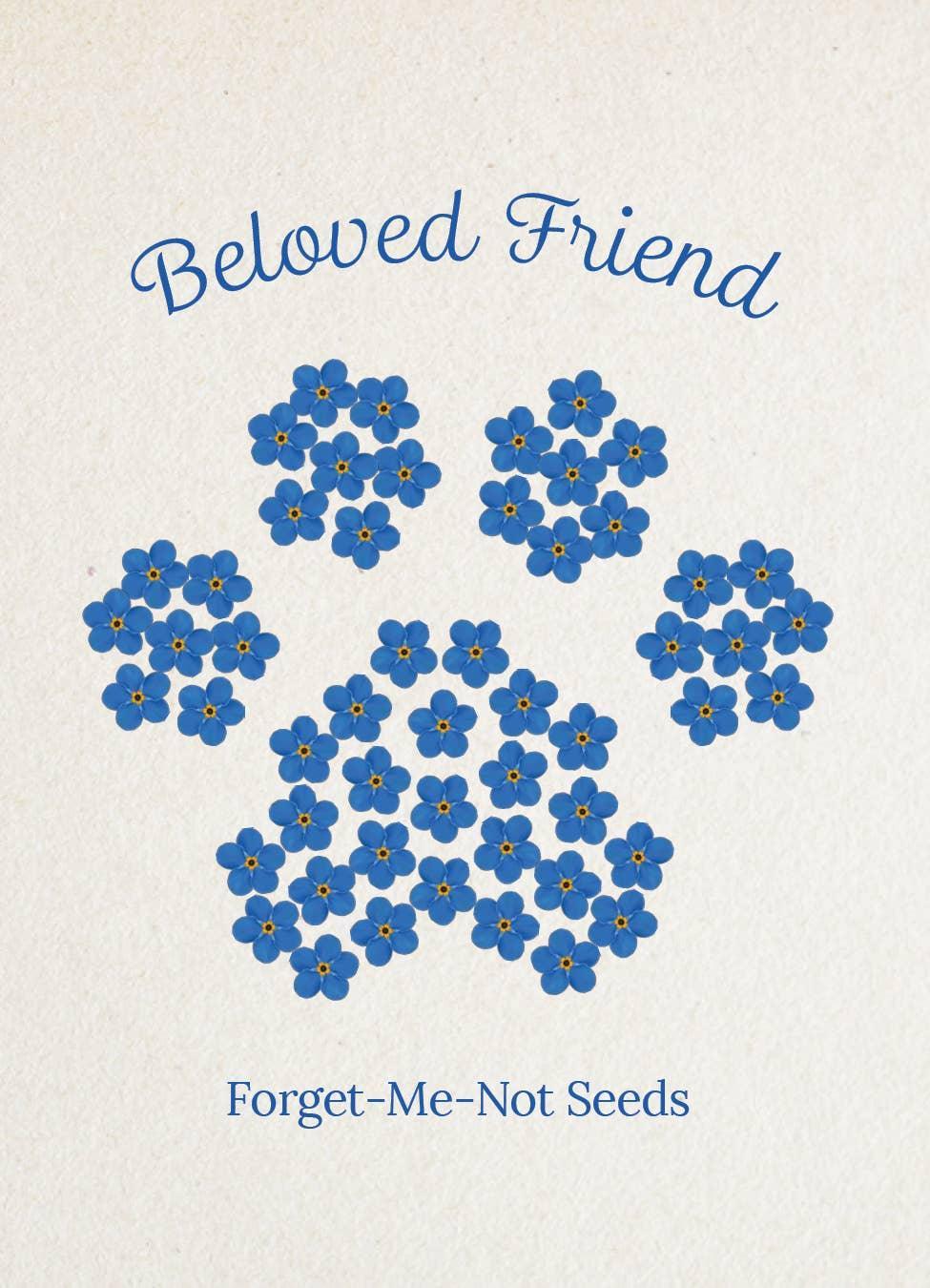 The Beloved Friend - Remembrance/Memorial seed packets with Forget Me Not seed are a heartfelt way to commemorate a beloved pet. Bentley Seeds' Forget-Me-Nots are a resilient variety of the flower that can withstand sunlight and heat. These charming blue blossoms grow on sturdy stems, making them the perfect addition to any bouquet. Also known as Chinese Forget Me Nots, they are an ideal choice for container gardens. To plant, simply prepare a bed or container with loose soil, sprinkle the seeds, and lightly cover them with soil. Keep the area moist until the seedlings appear, then thin them to 12" apart. Pruning the stems will encourage a fuller growth. Packet size: 3 ¼" x 4 ½".