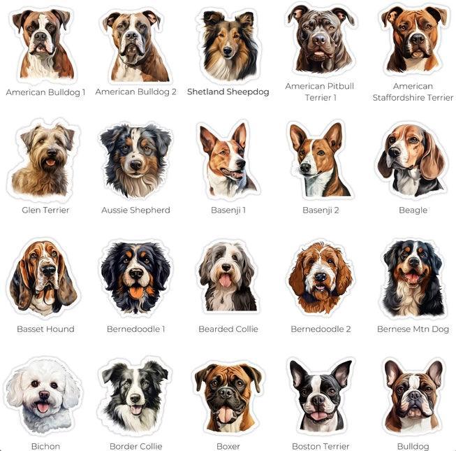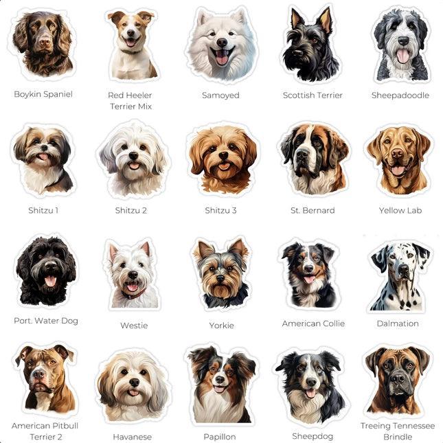 Vinyl dog stickers in an assortment of dog breeds Add some personality to your life with these adorable vinyl dog stickers! Create a fun and charming atmosphere wherever you go. Perfect for any dog lover!
