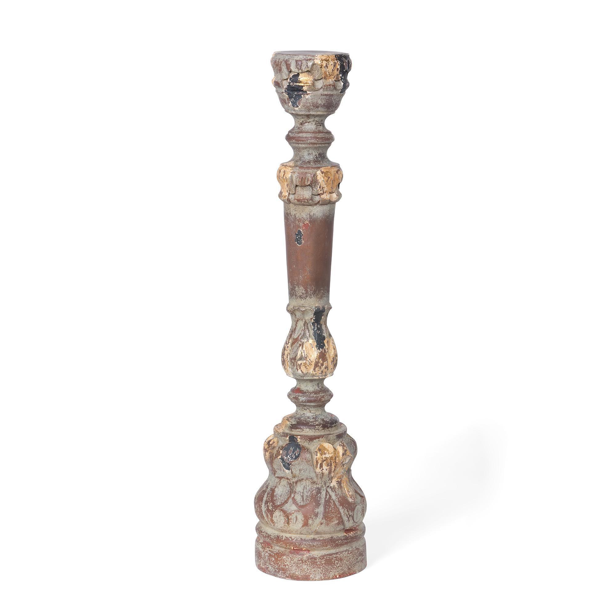 Our Delgado Carved Wood Candle Holder collection is a beautiful assortment of intricately carved and painted candlesticks. These destressed pieces are substantial, yet elegant, making them a striking design element for stately homes and upscale events. The 28” candle holder has a curved pedestal base and detailed column structure. Its capital supports a 2” pillar candle.
