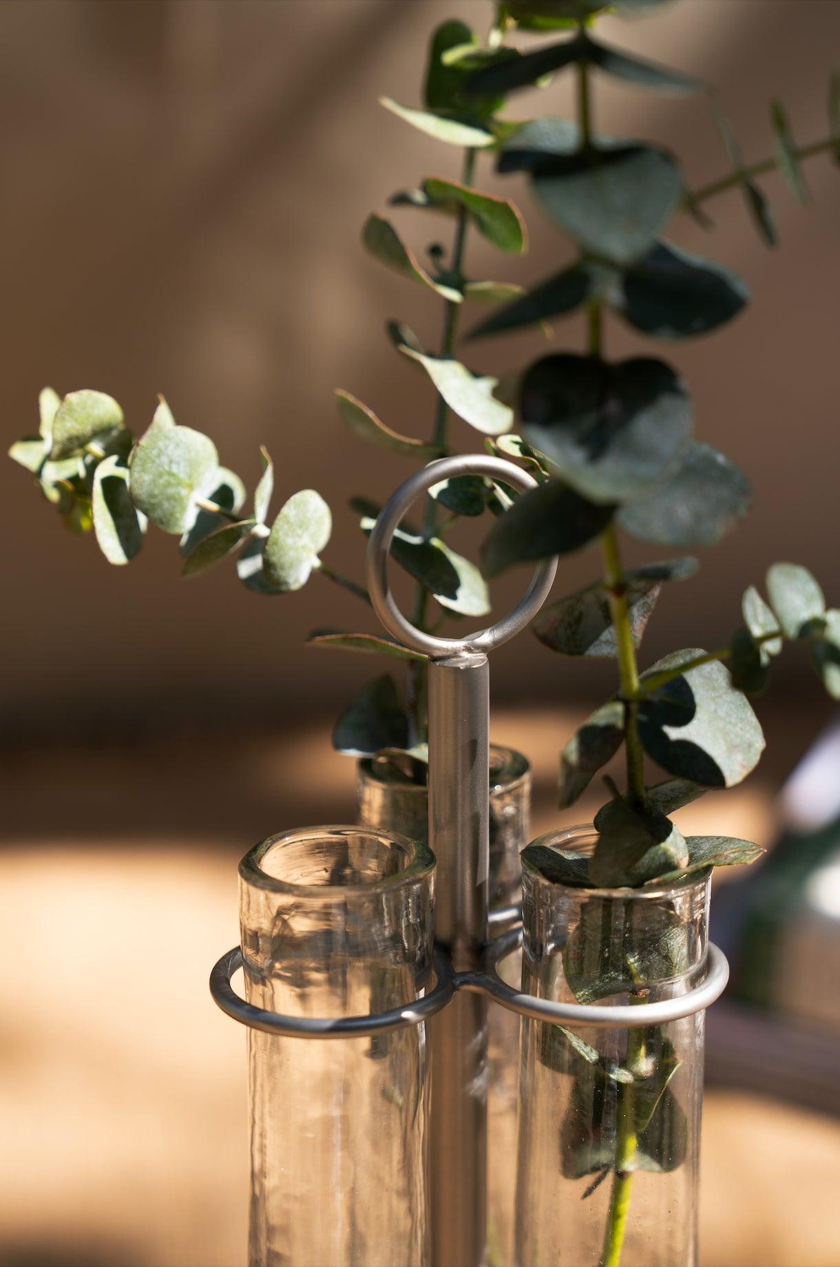 Elevate your floral arrangements with our Floral Trio Table Vase. Featuring three glasses for multiple stems, this vase is perfect for creating a stunning centerpiece. The hammered texture and pewter finish add a touch of elegance, while the ring handle allows for easy transportation. Upgrade your decor with this must-have vase.