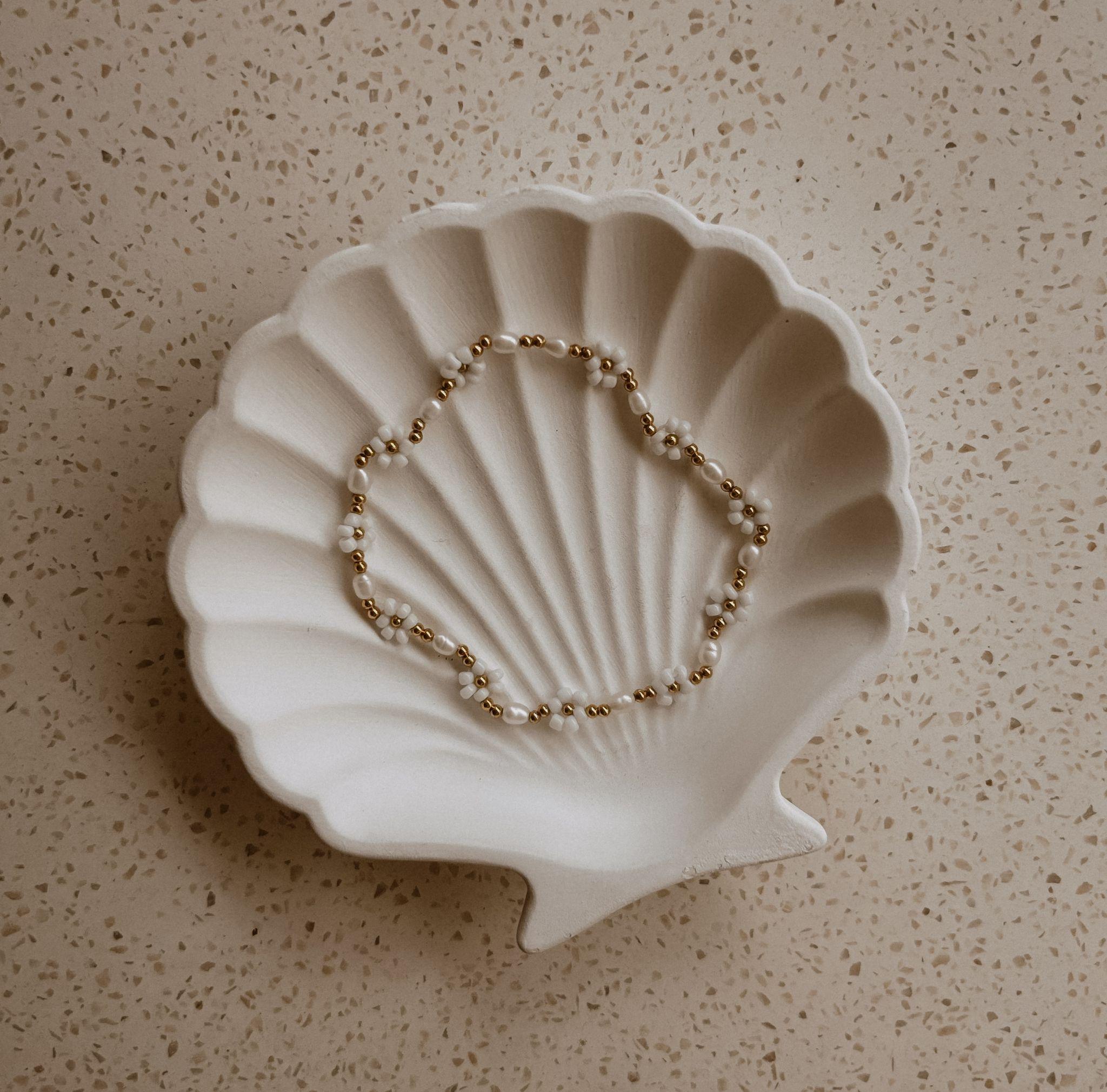 Elevate your style with this handcrafted bracelet featuring lustrous freshwater pearls and delicate beaded flowers. Designed to complement any outfit with its elegant white and gold accents, this dainty bracelet is made with strong elastic string for a comfortable fit on most wrist sizes. A perfect blend of sophistication and charm, this piece adds a touch of grace to your everyday look.