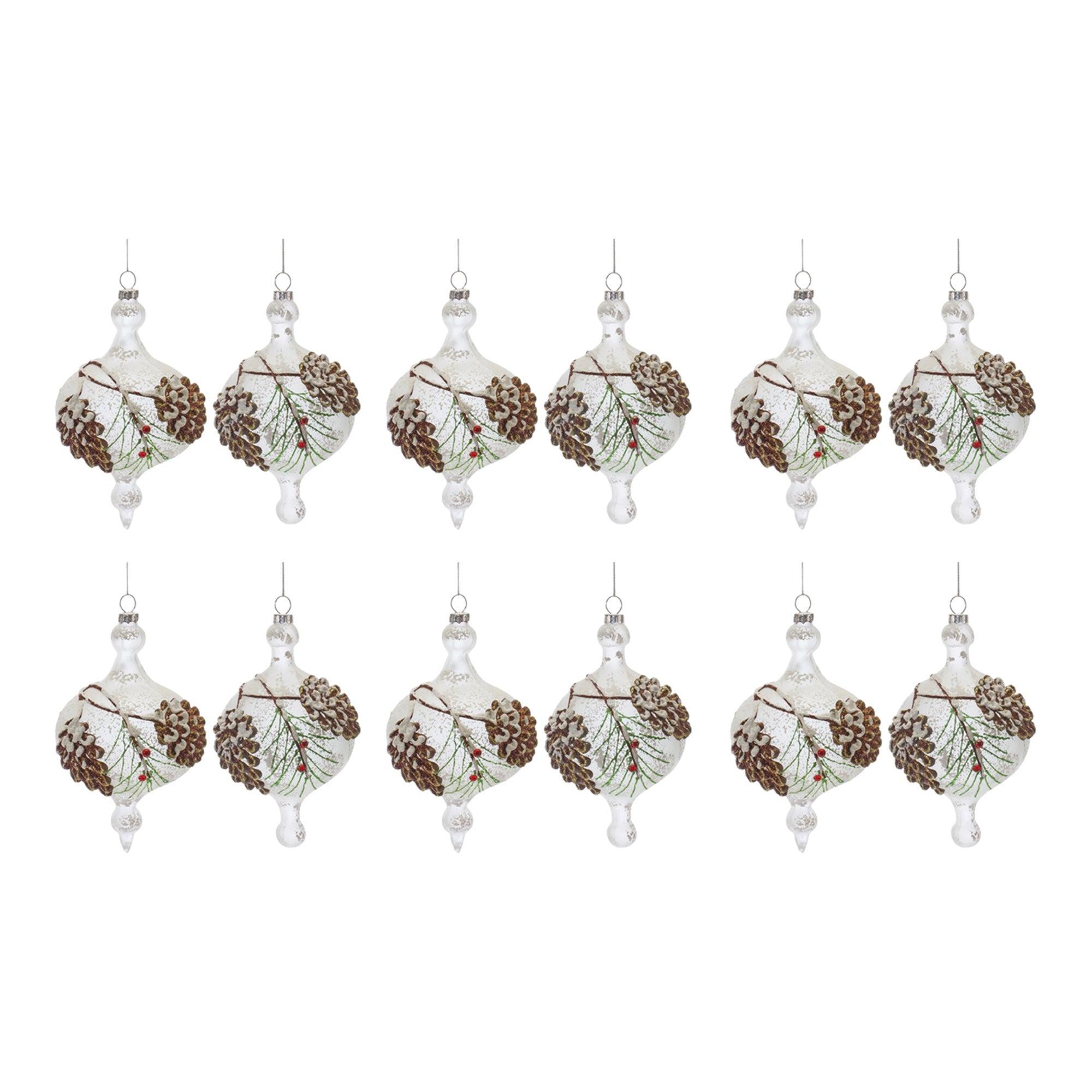 Adorn your Christmas tree and holiday decor with this stunning set of Glass Pinecone Onion Ornaments. Featuring 12 pieces, the rustic brown, wintry white and earthy green tones paired with the onion design is the perfect combination to create a memorable display. The quality glass composition and delicate silver string hanging accent is sure to endure for seasons to come. Whether you're adding a touch of cheer to your home or gifting to a loved one, these ornaments will definitely bring smiles.