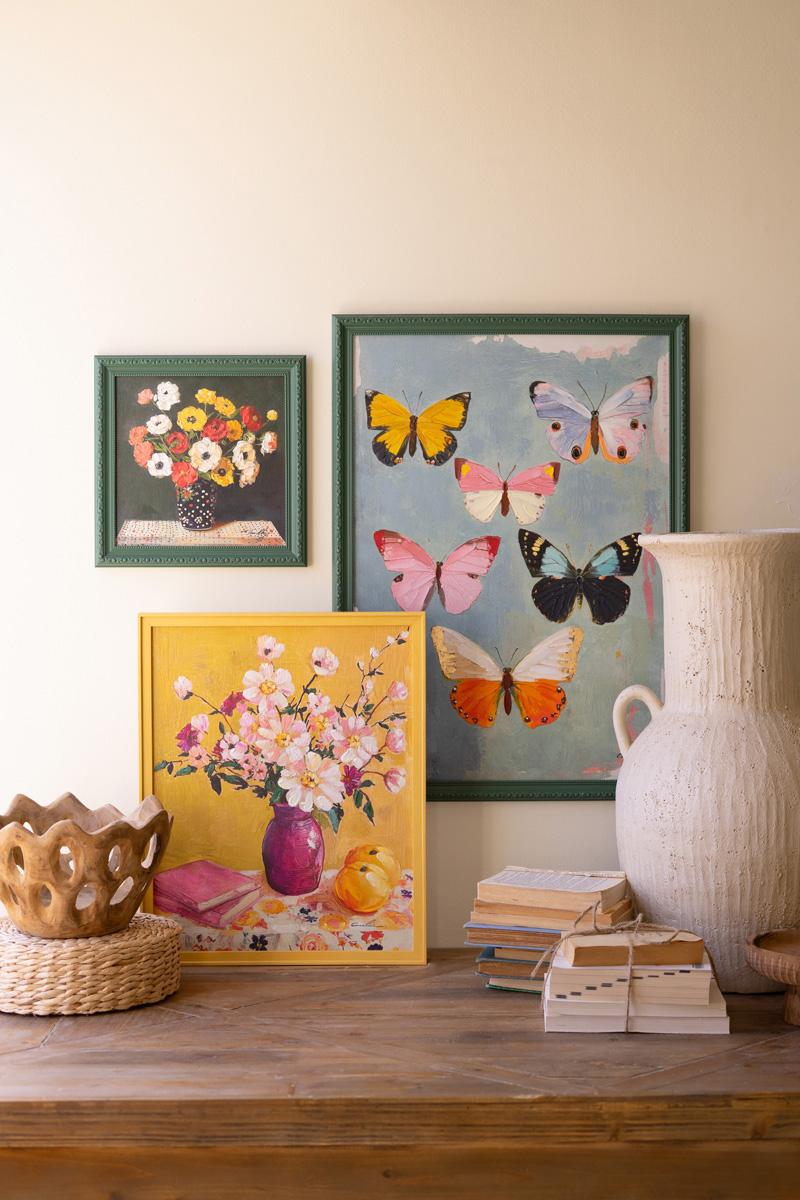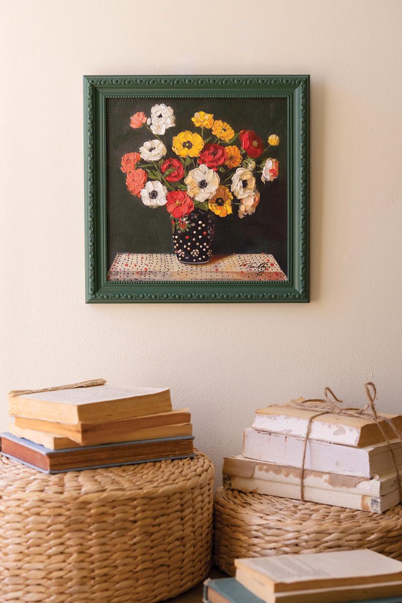 Need a pop of color for a neutral wall? Try this green framed still life of a dark vase with red, white, and yellow flowers. The painting measures 13" square. Textured paint. One sawtooth hanger.