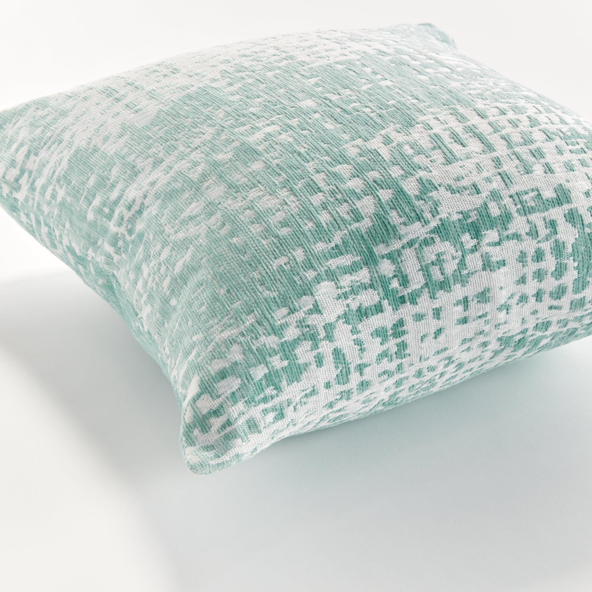 The indoor pillow that lives beautifully outdoors. Enjoy the upscale luxury and durability of Jacquard. With a woven seafoam pattern, it plays well with any palette. This pillow is weather resistant and responsibly made. Filled with 100% recycled fibers.