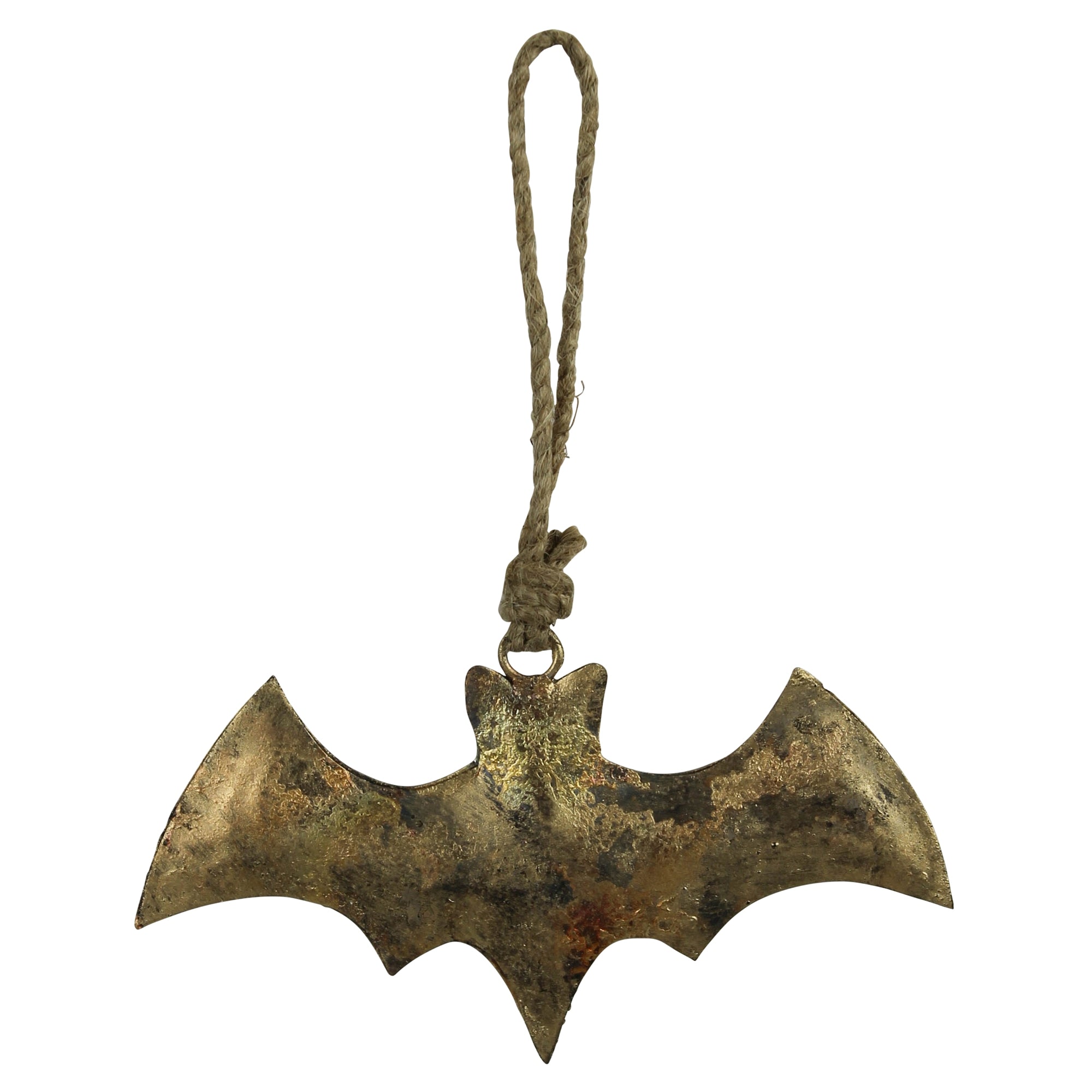 Antique brass details lend a gentle shimmer and rustic air to these hanging metal ornaments. 4” rope