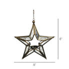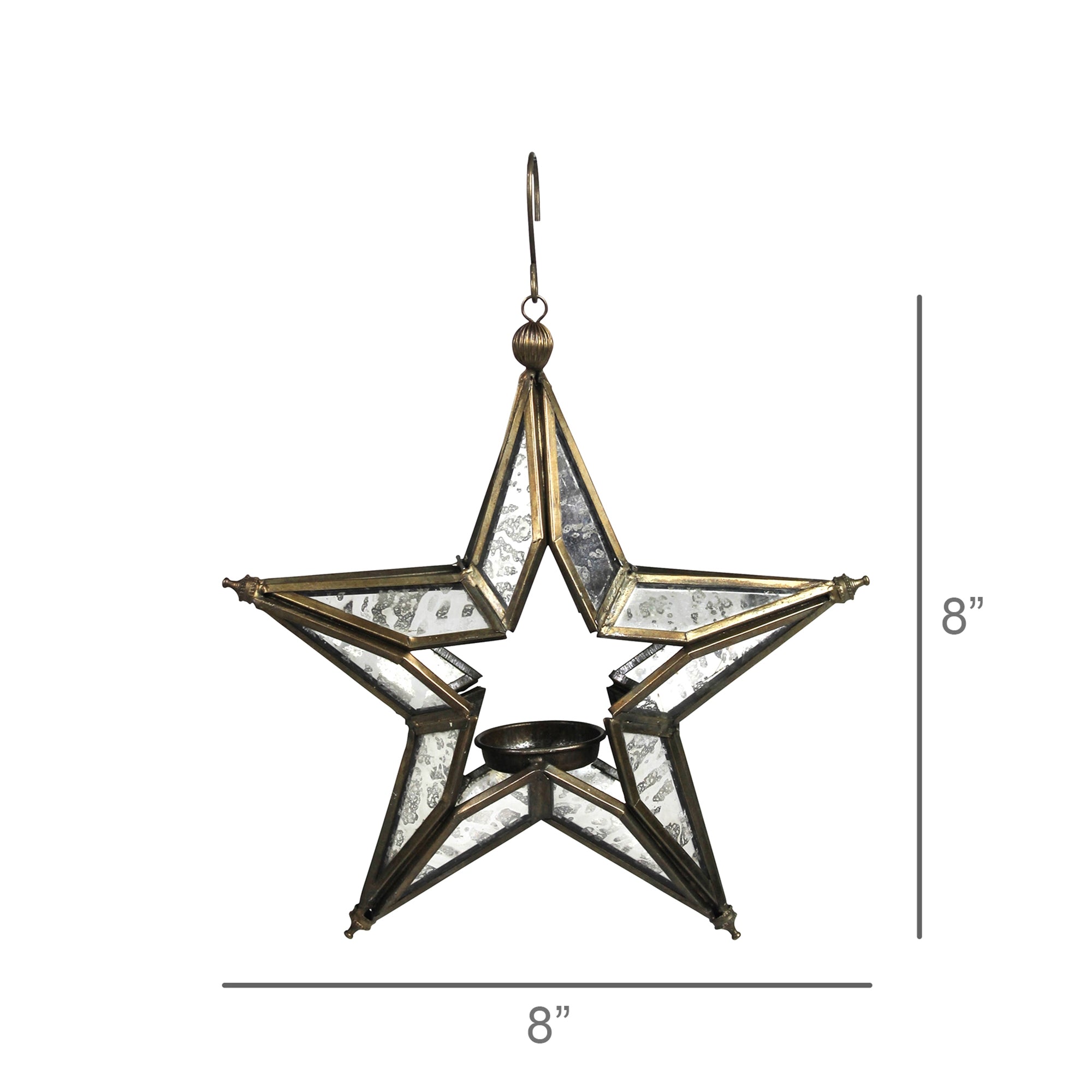 Leaded brass with antiqued mirror house a tealight candle. Hangs from a 2” hook. 2” hook