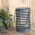 Galvanized straps provide the perfect illuminated form for candlelight in the garden, either hanging or sitting. Includes a glass hurricane to protect the candle from wind. Handle height measures 8"