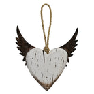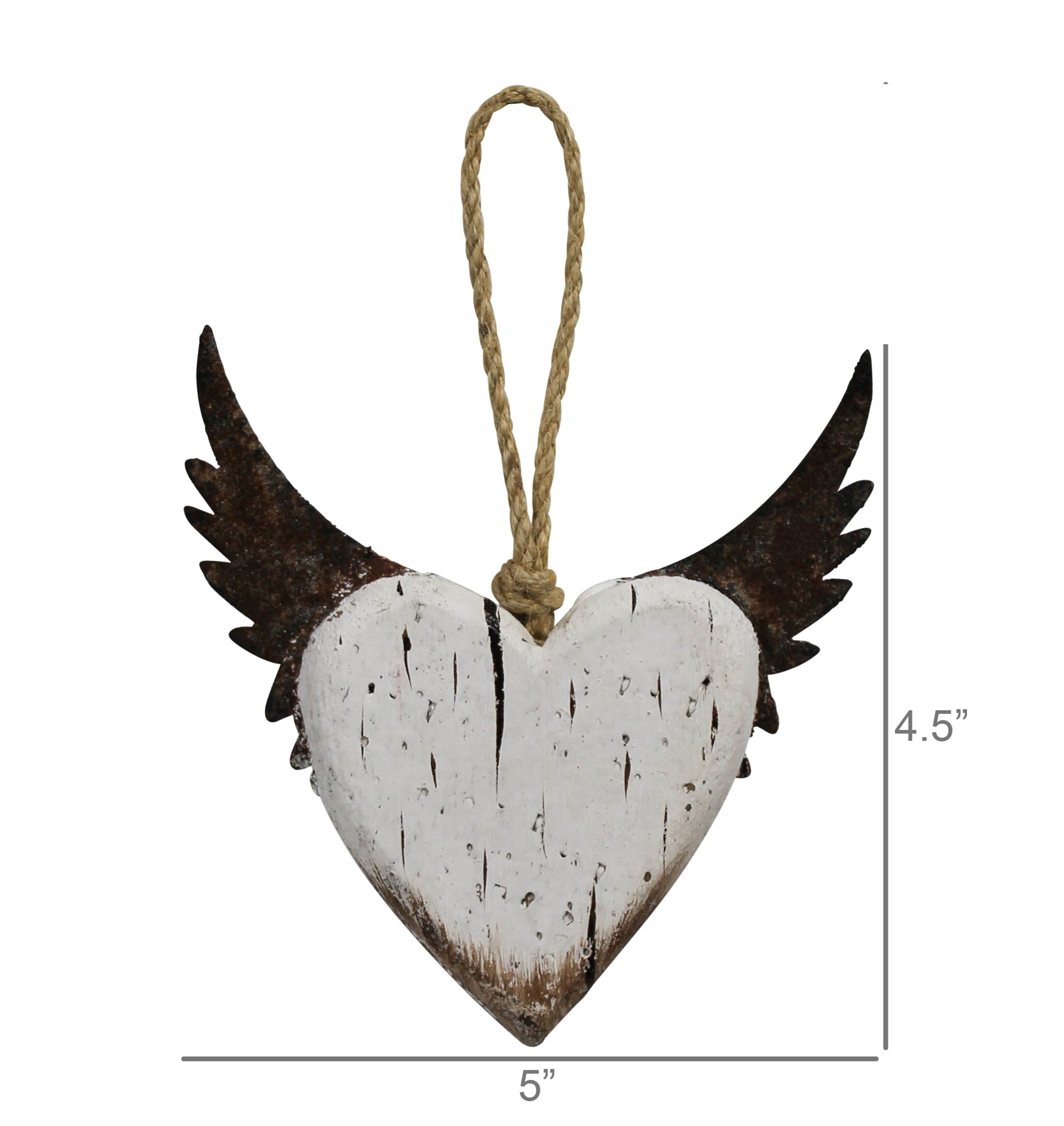Handcrafted from rustic wood, the heart with metal wings evokes a sense of warmth and whimsy. Its unique design brings a charming blend of nature and artistry to any space, making it a perfect addition to your home or a thoughtful gift. 3” rope hanger