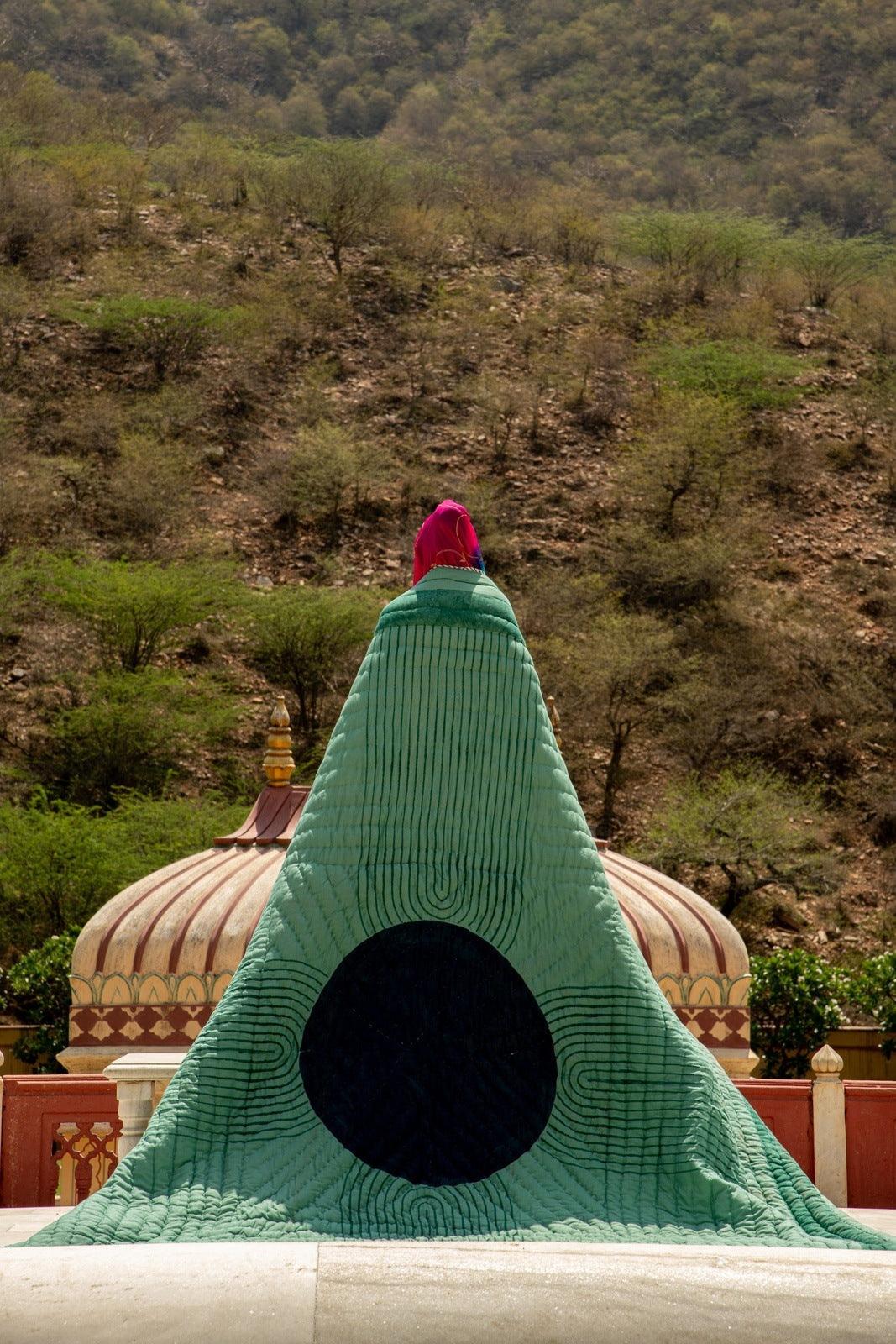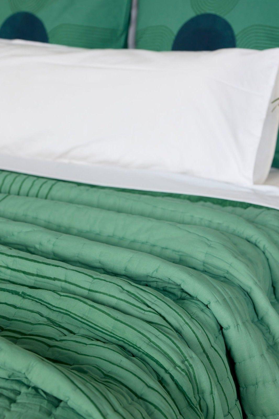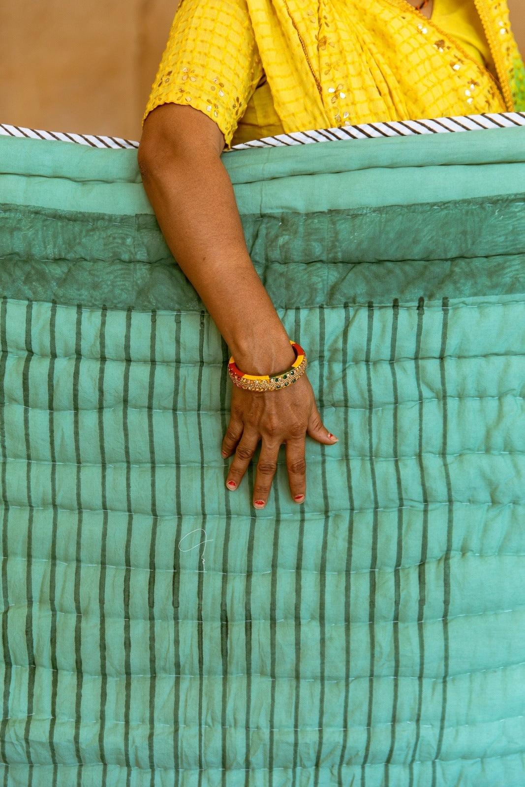 The design is hand-pressed onto each quilt using hand-carved wooden blocks dipped in dyes. The printed cotton shells are brought to the homes of quiltmakers, who stuff and stitch the quilts by hand, creating the final product.