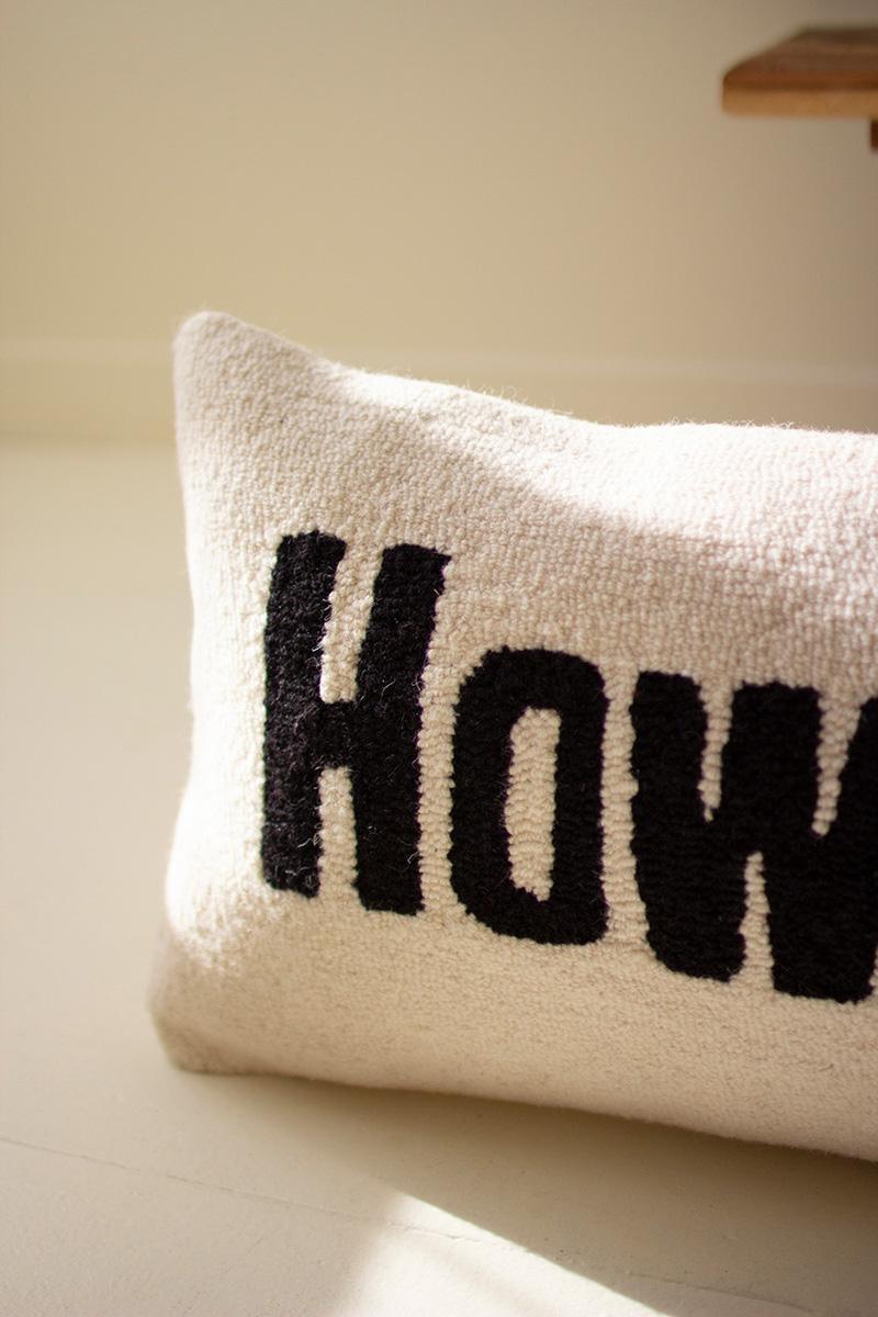 Cowboys and girls get this hand-hooked pillow. It proclaims Howdy! making it the perfect porch pillow or guest room accent. The pillow is a natural color with black writing.