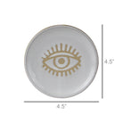 This round trays with a gloss white glaze over natural ceramic with an eye icon serve as a coaster or a place to catch coins, knick knacks and jewelry.