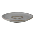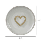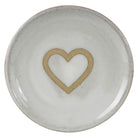 This round tray with a gloss white glaze over natural ceramic with a heart icon serves as a coaster or a place to catch coins, knick knacks and jewelry.