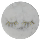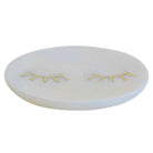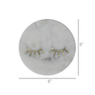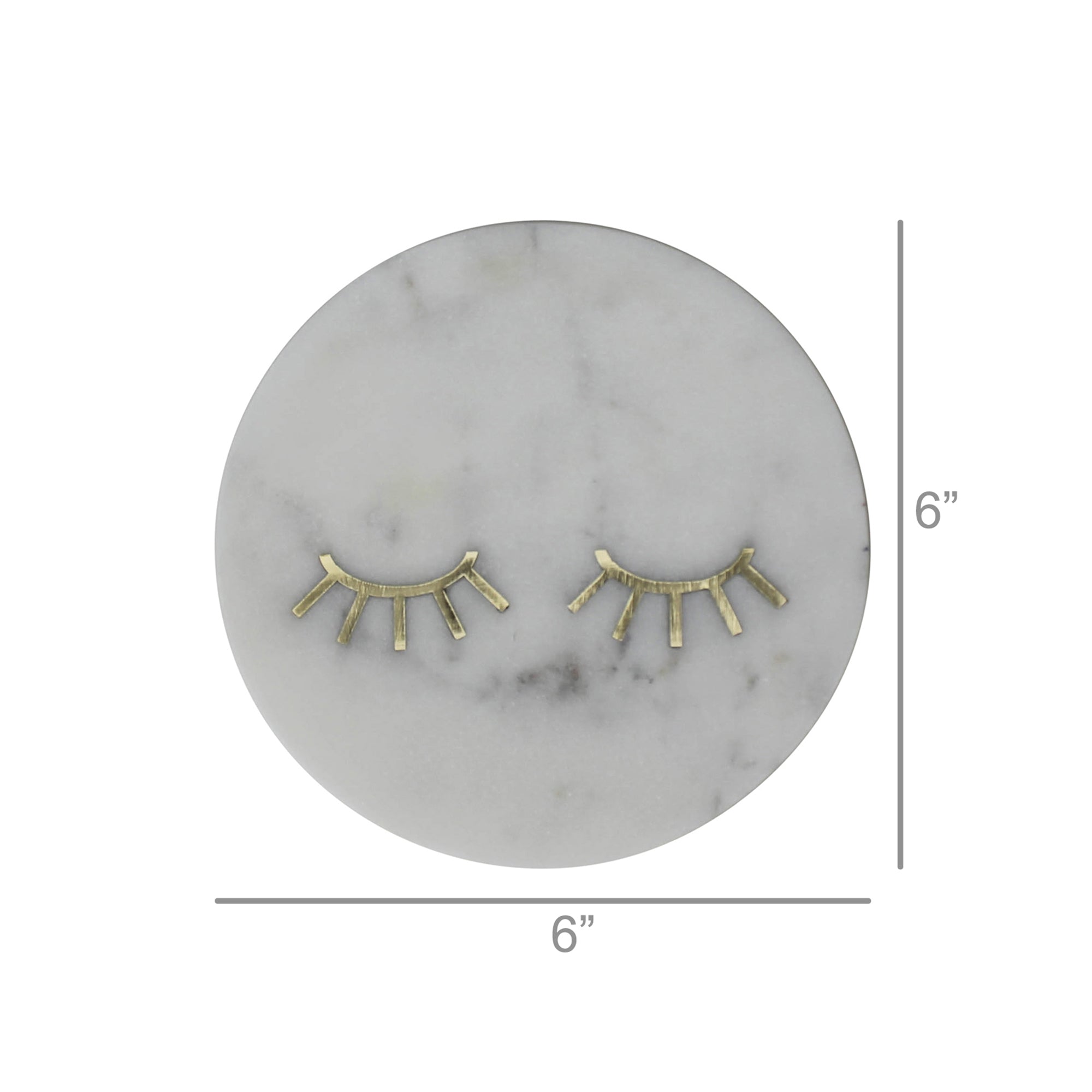 Thick white marble is honed with a soft indentation and inset edge then dressed up with happy-making and smile-inducing inlayed brass icon.