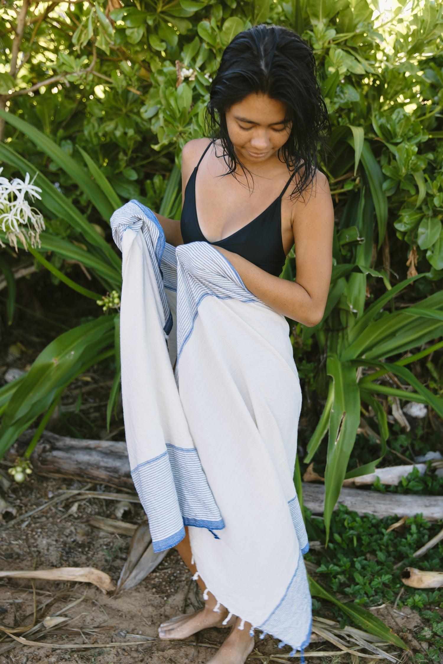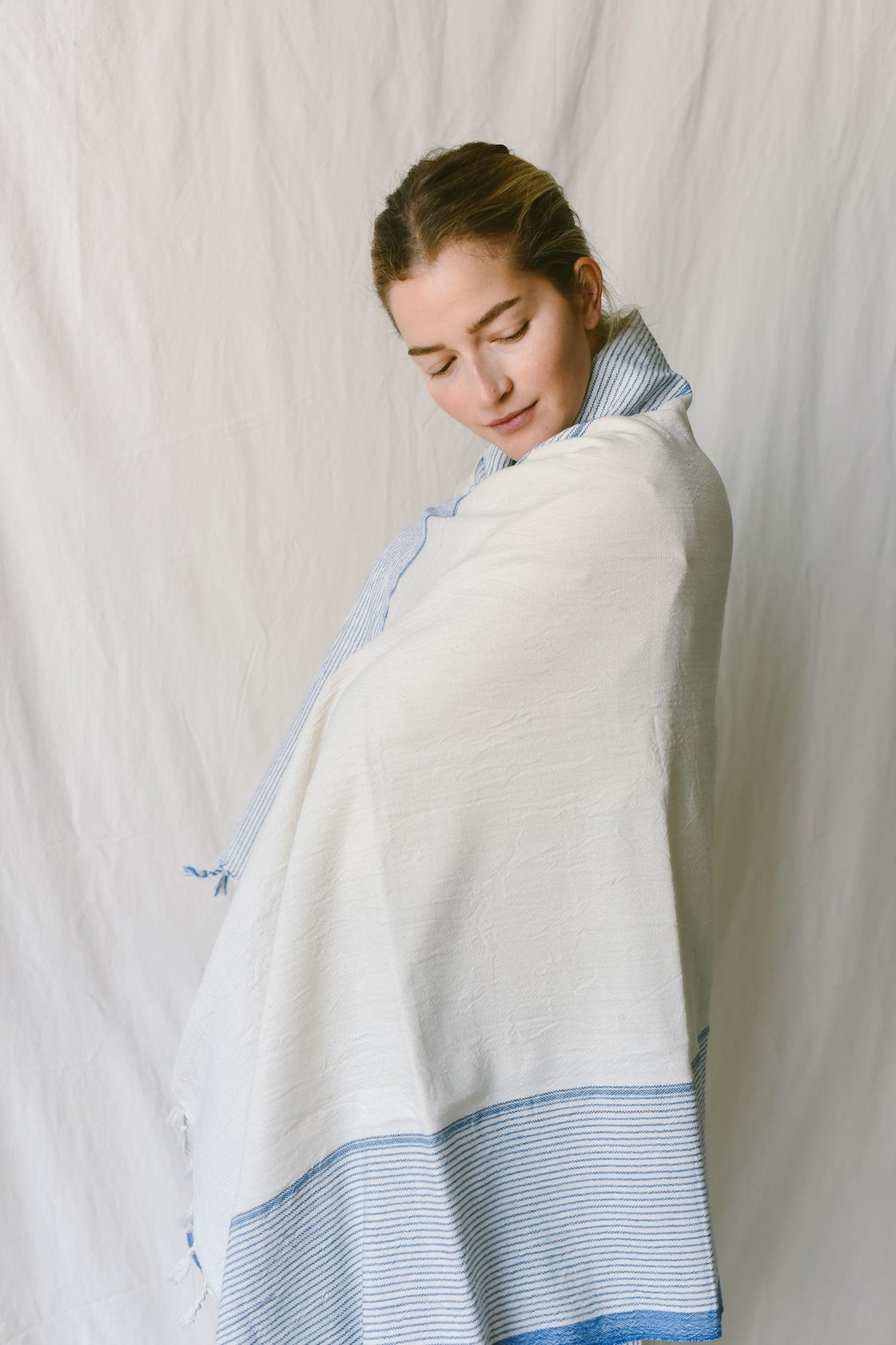 Our Ivory Blue Tribeca Turkish Towel, also known as a pestemal, is handwoven by skilled artisans from premium quality ethically sourced cotton. Each piece is crafted using ancient weaving techniques that have been passed down for generations. Lightweight, beautifully soft, and highly absorbent, our towels are perfect for use after a shower, at the beach, as a sarong, and so much more.