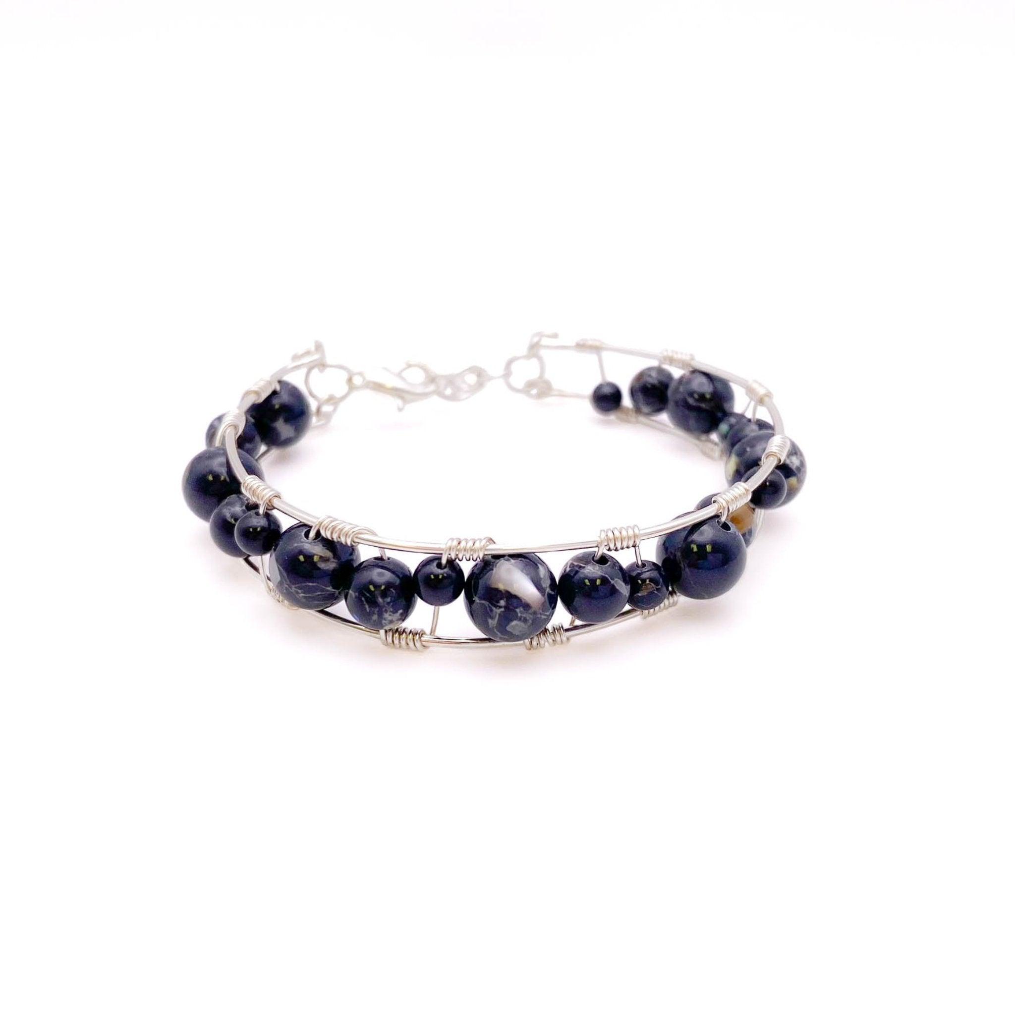 Bangles, they are on trend this summer! 3 sizes of mottled black jasper beads slide freely on silver wire between the two outside wires of this fun bracelet. A lobster clasp and silver extender safety chain keep this bangle securely fastened at just the perfect length for all wrists.